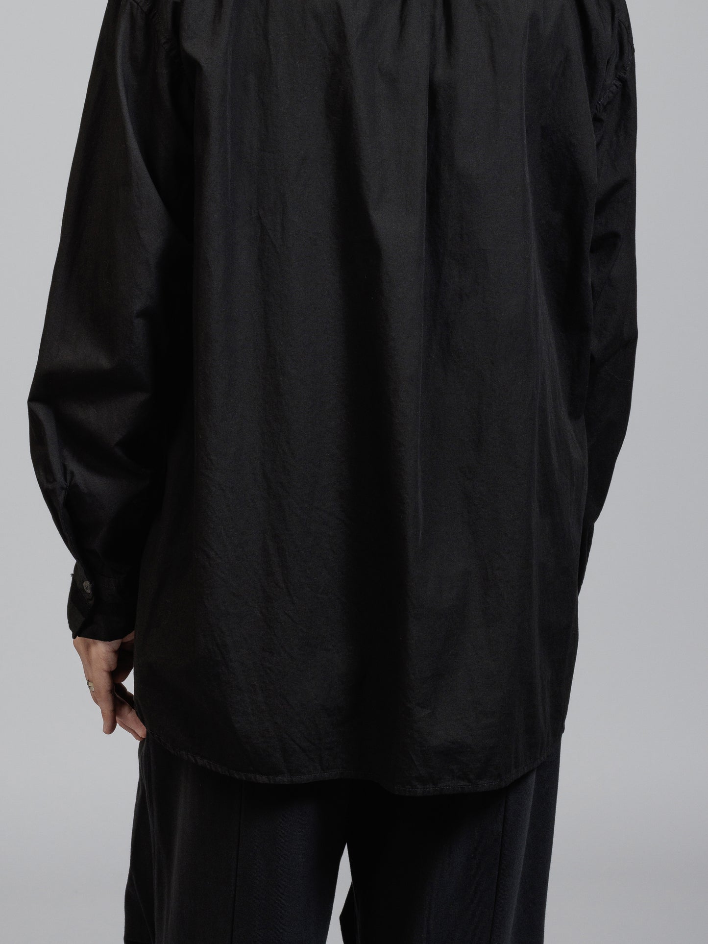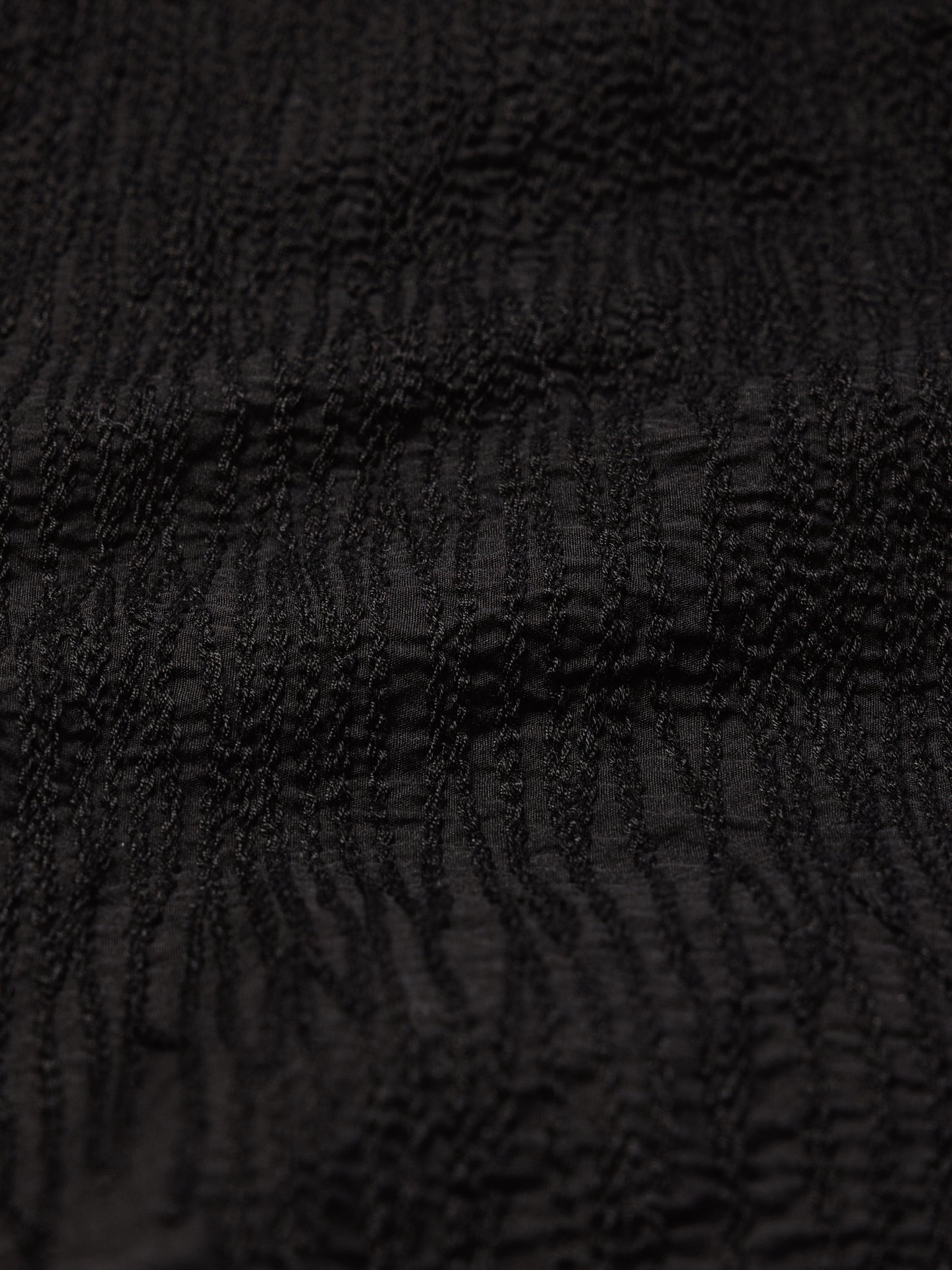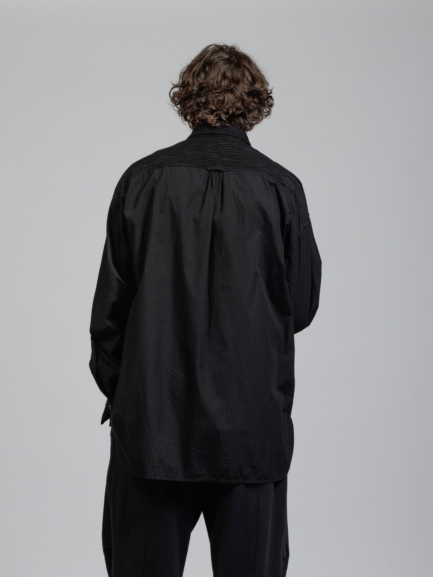 ランダムに配置されたチェーン刺繍生地と無地コットン生地を組み合わせた長袖シャツ。