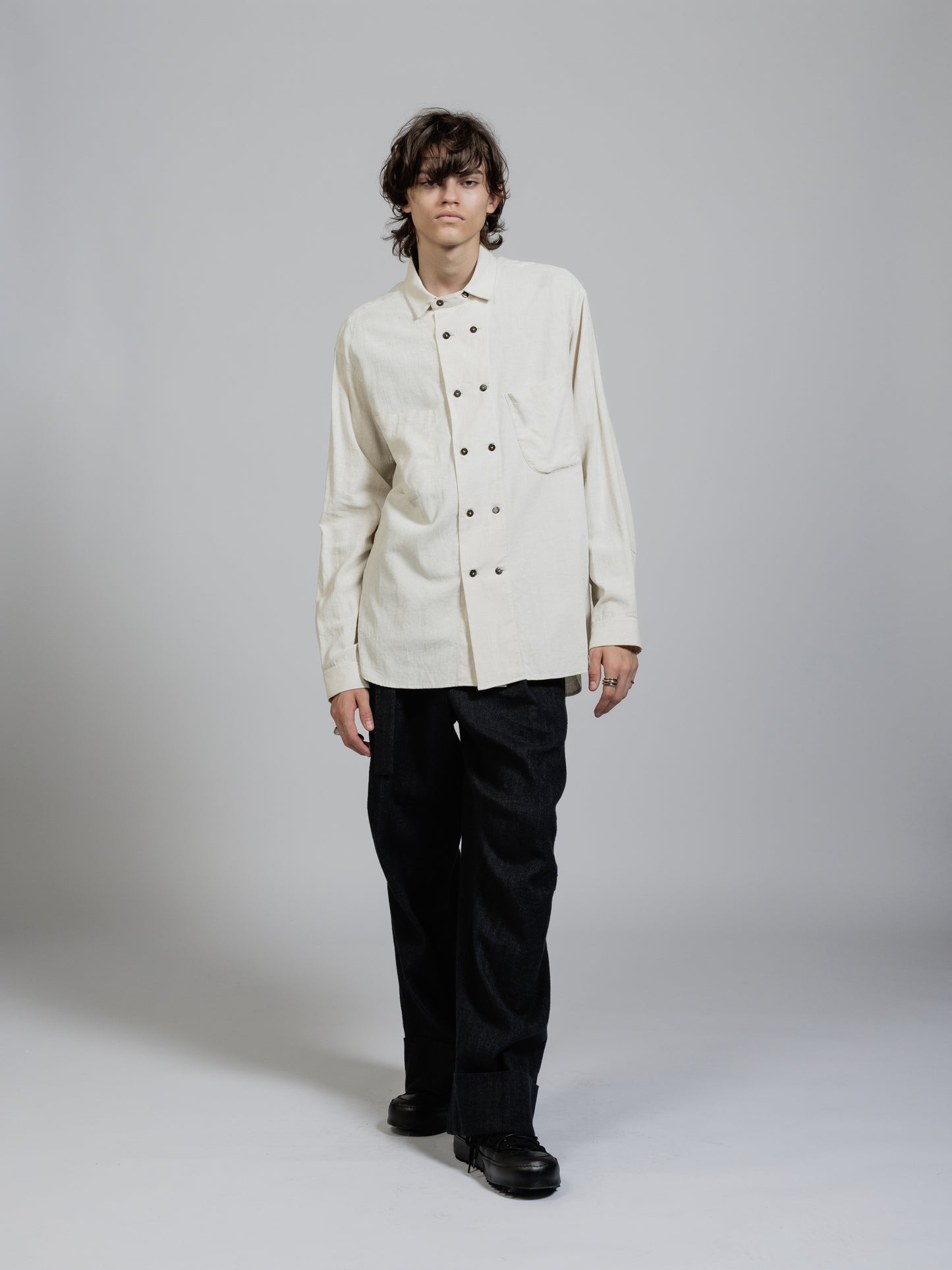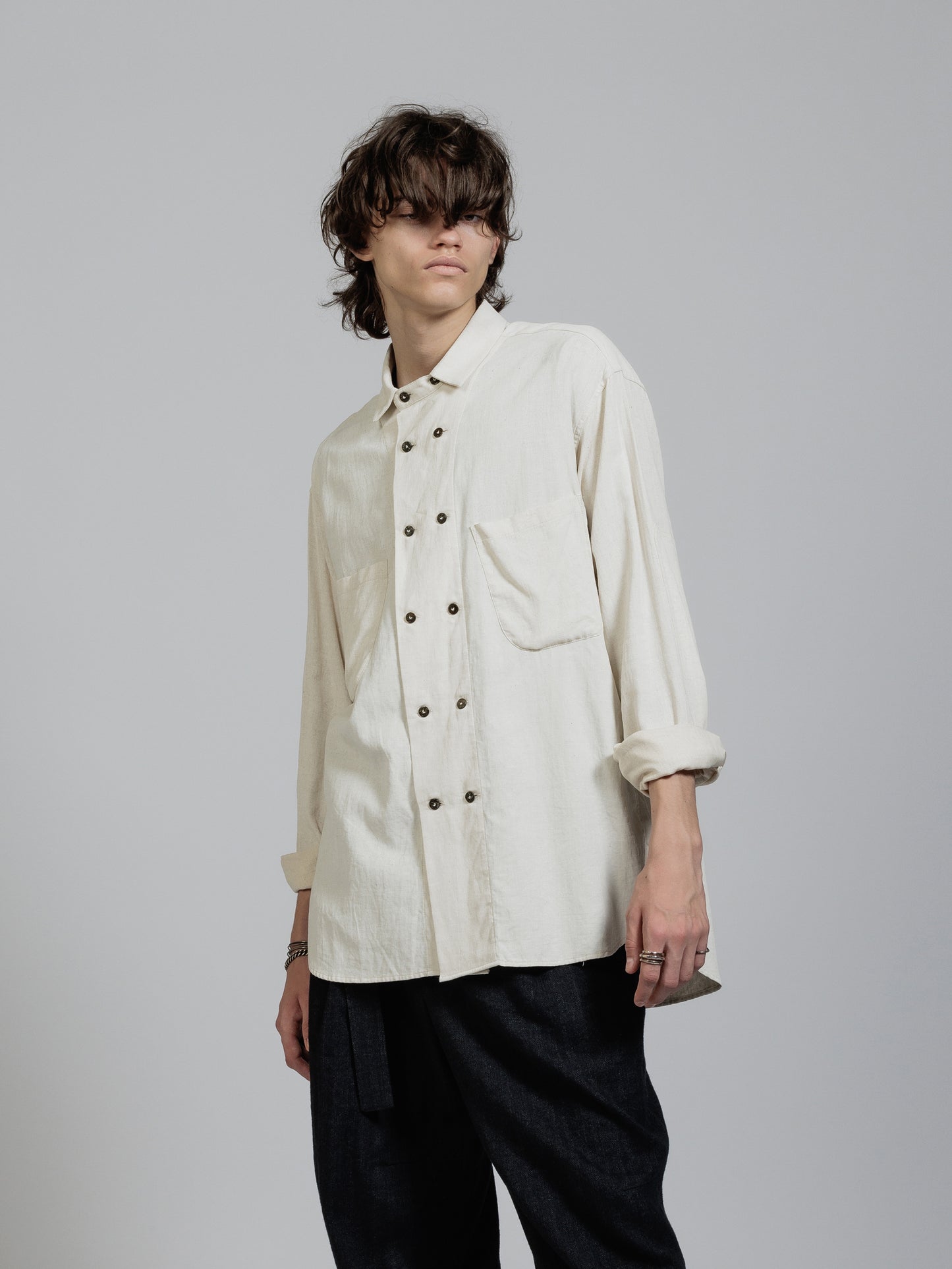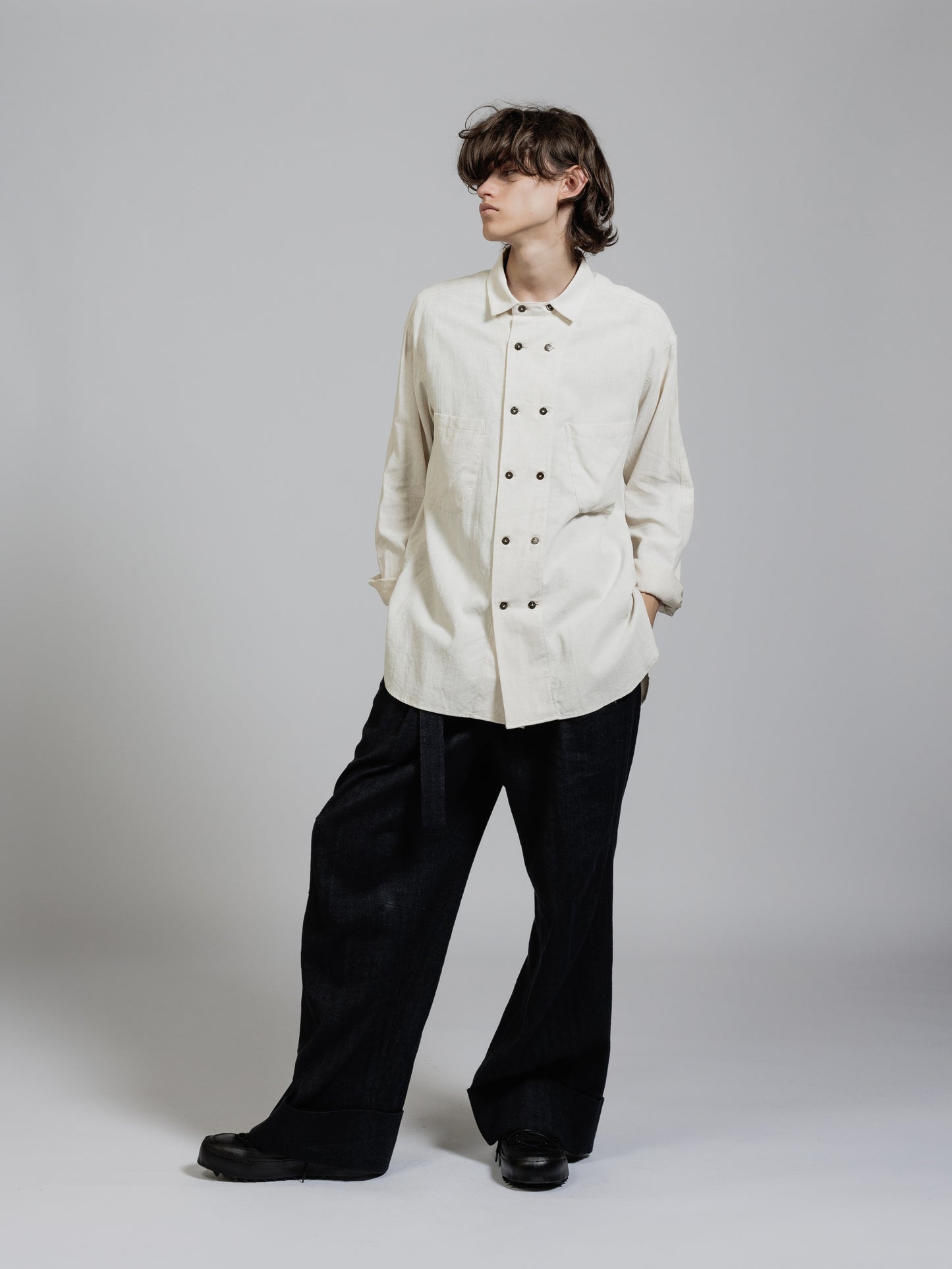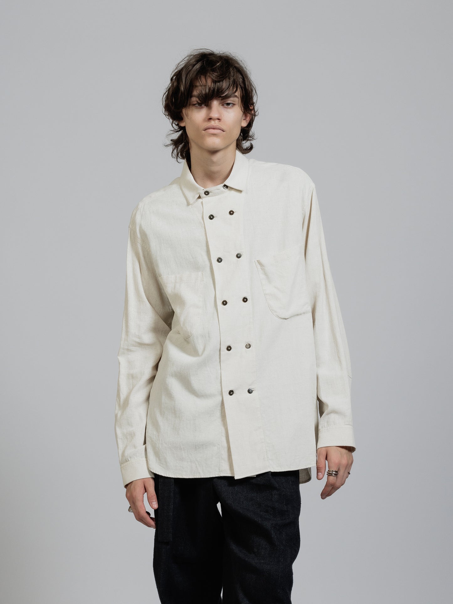 ピグメントプリントを施したコットンリネン生地を使用した長袖シャツ。