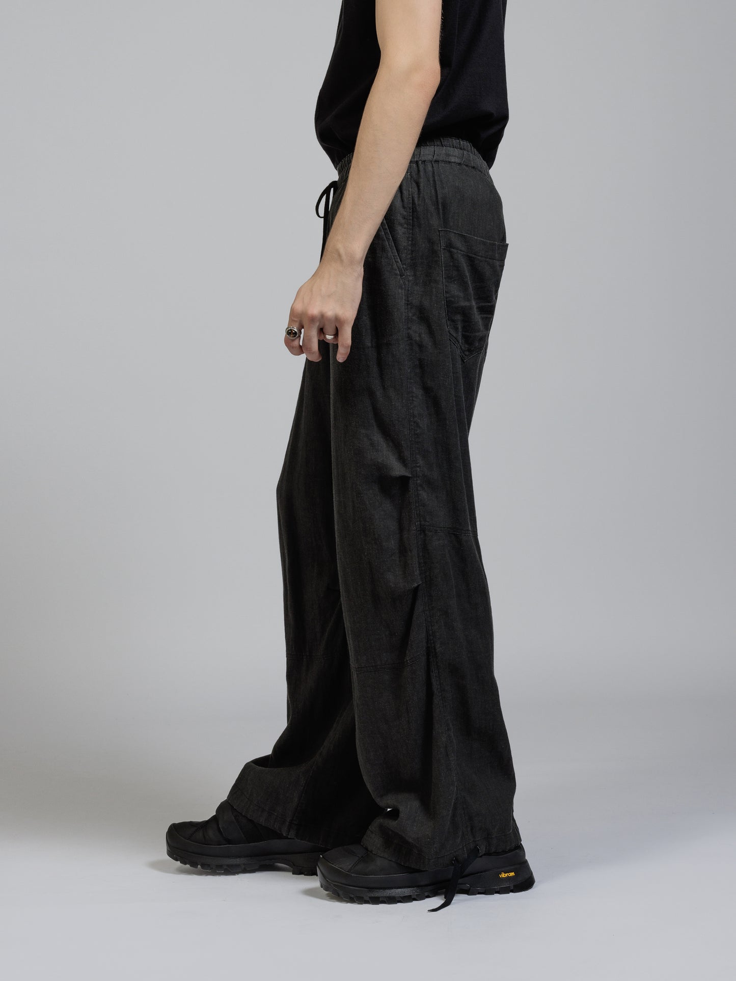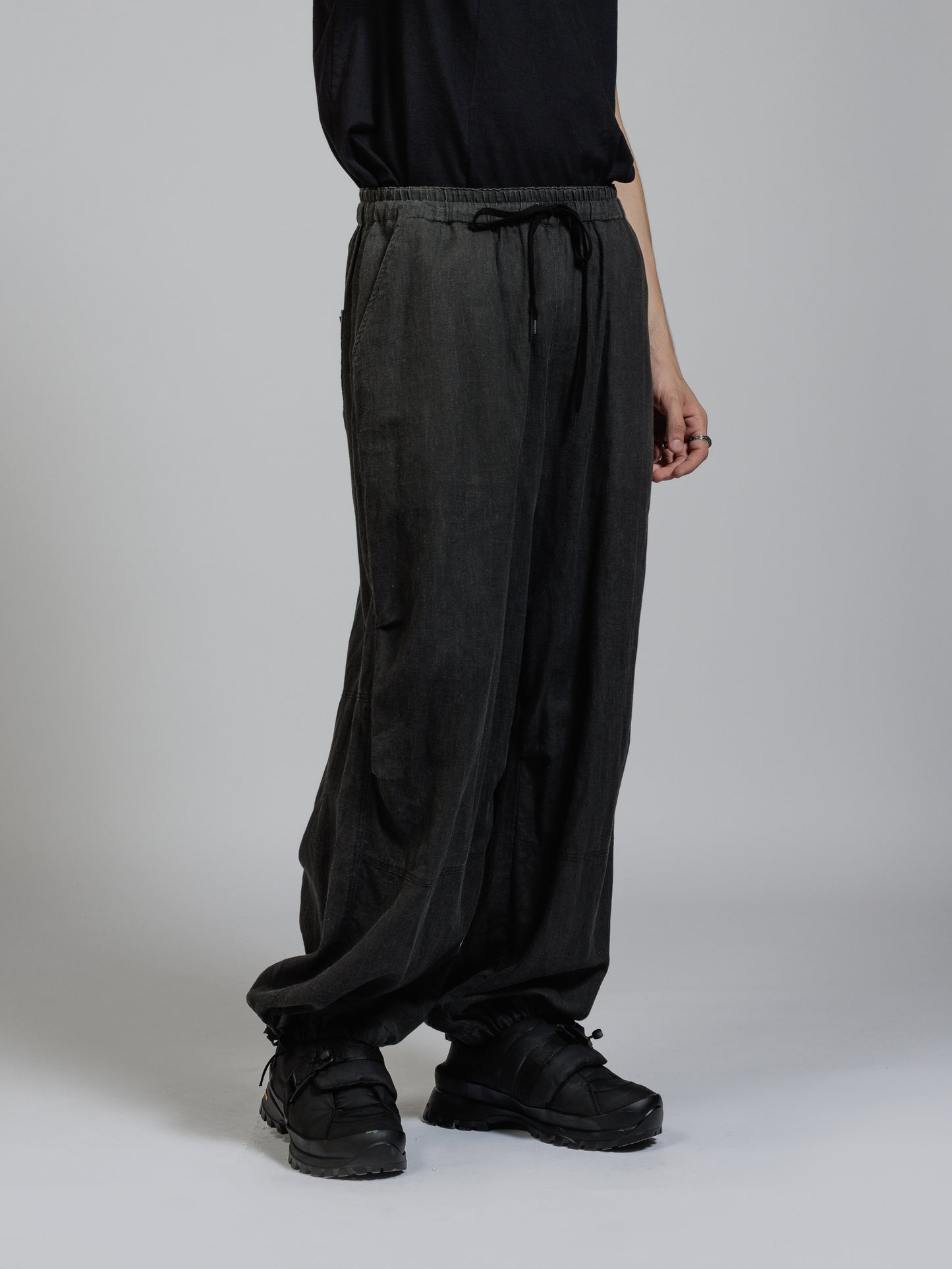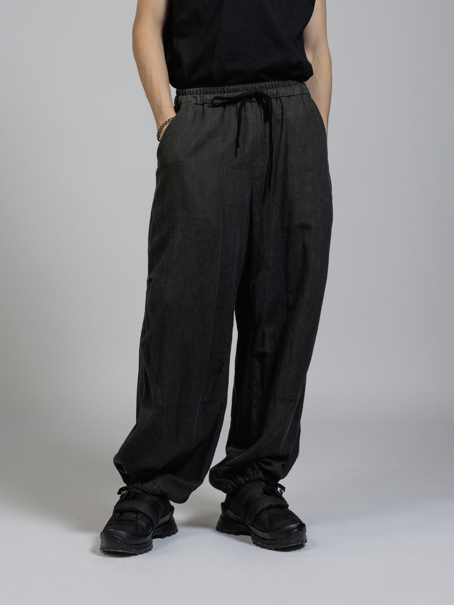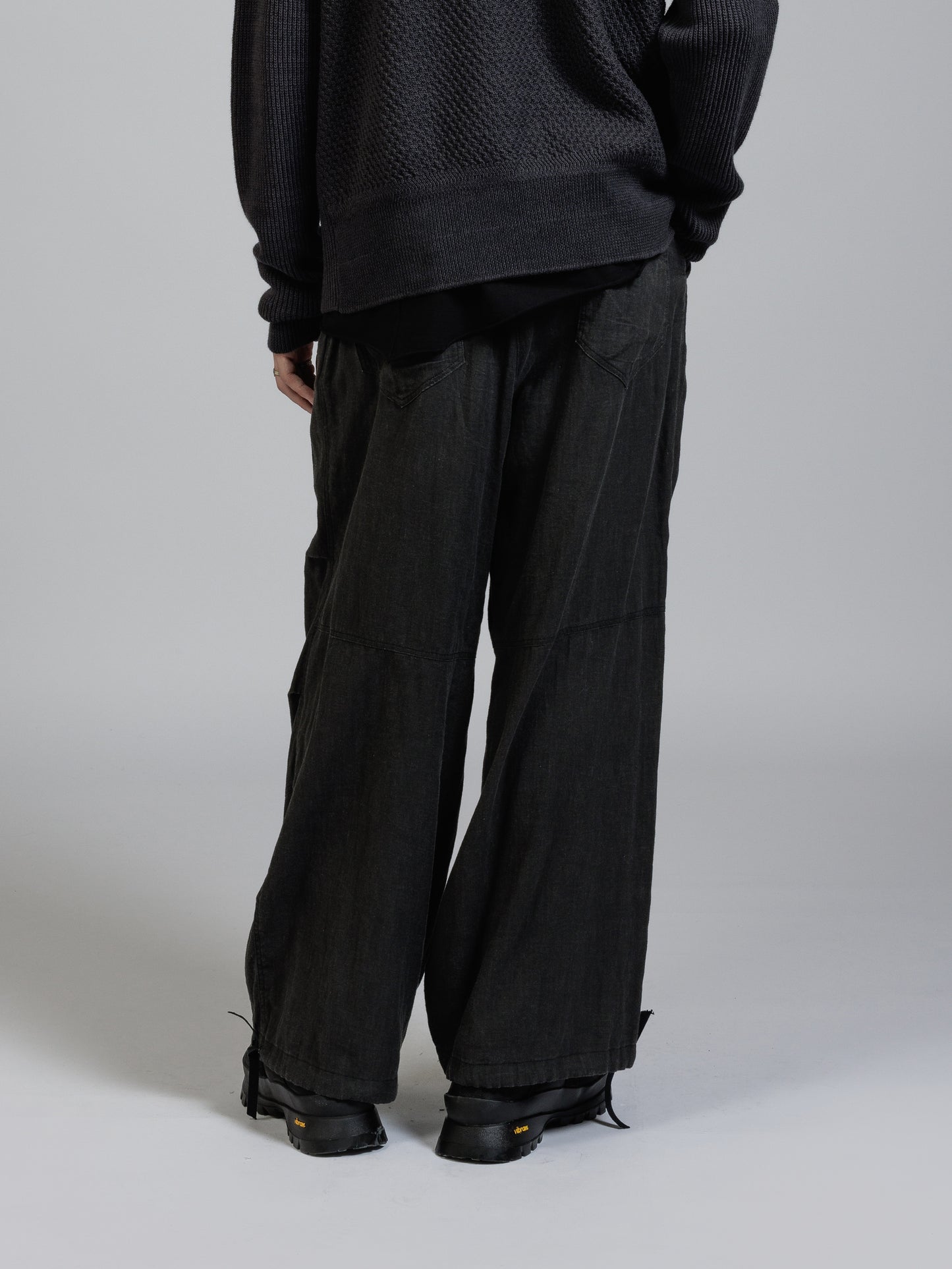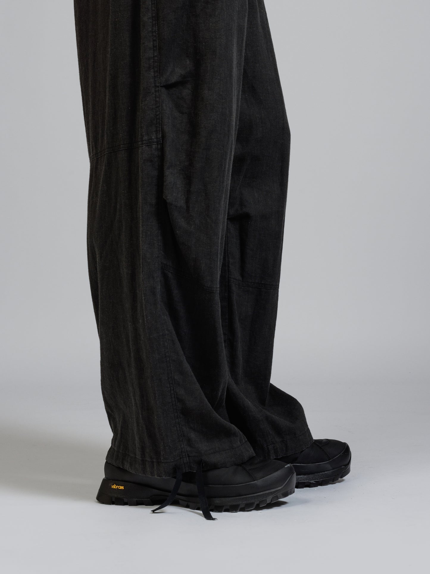 ウエストから裾に向かって大きく広がるバギーシルエット。