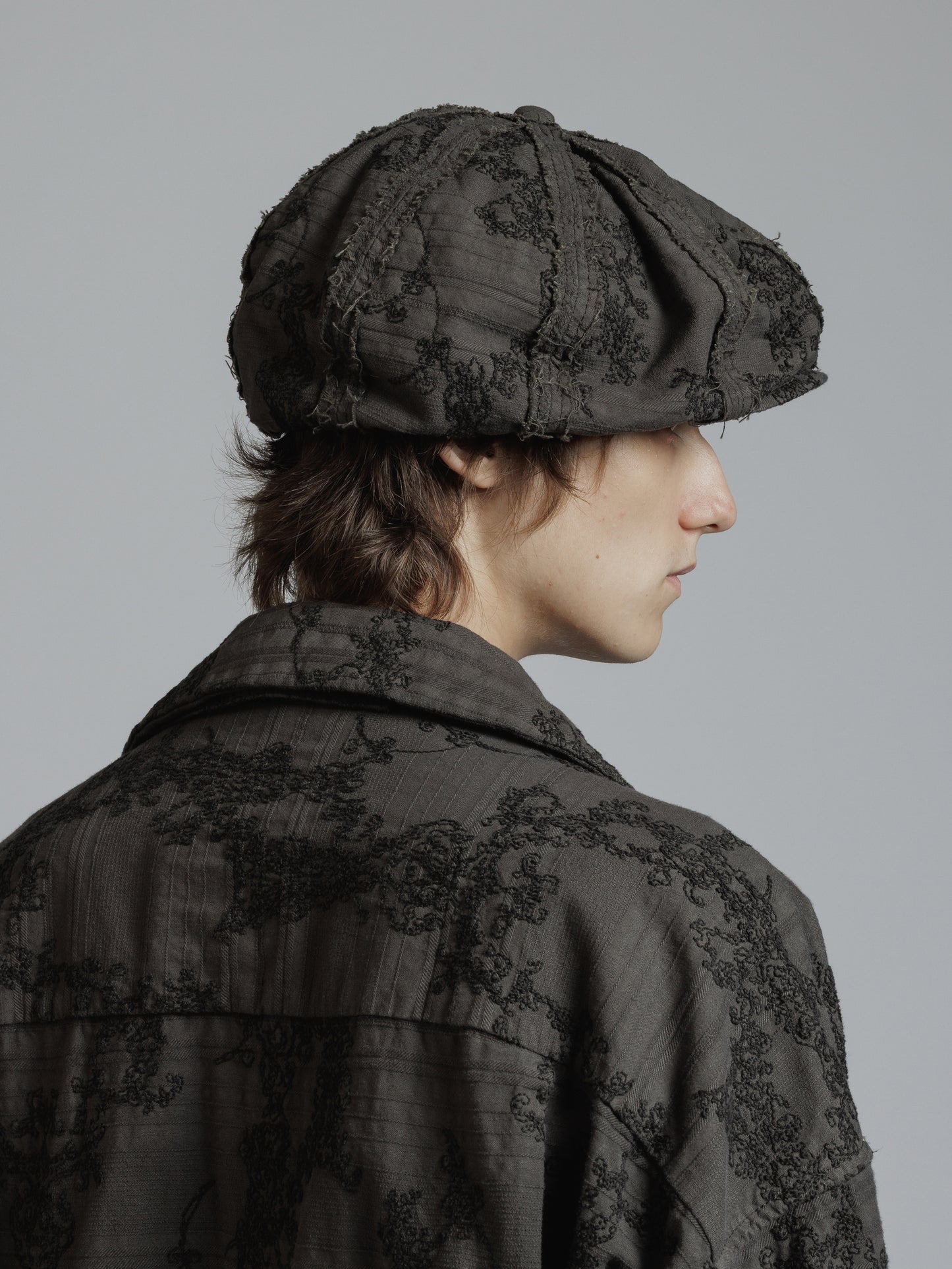 ・ドビーストライプ地にアールヌーボー調の抽象的な柄を全面刺繍