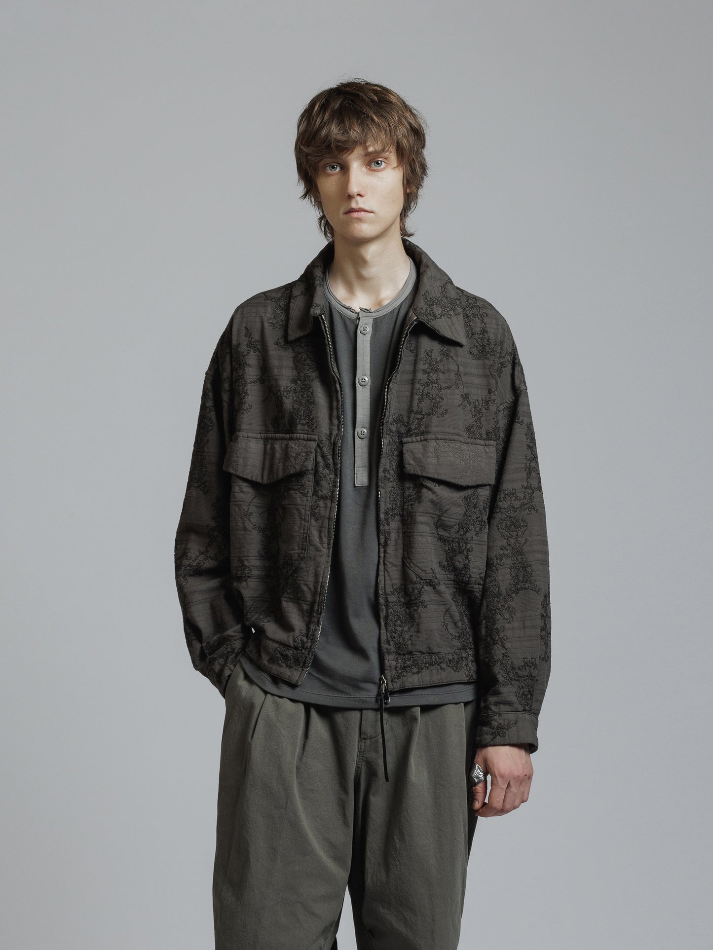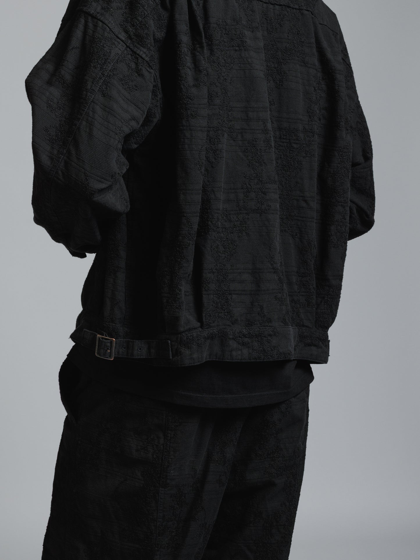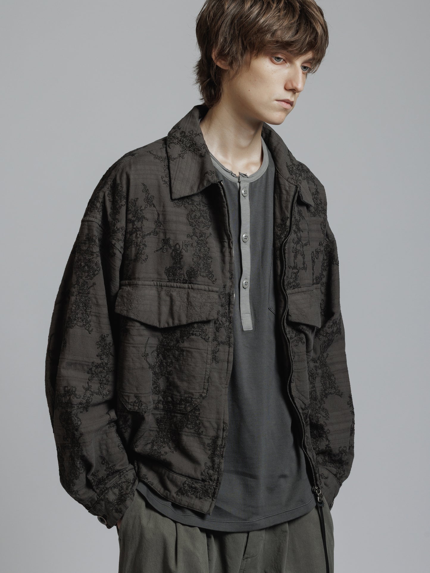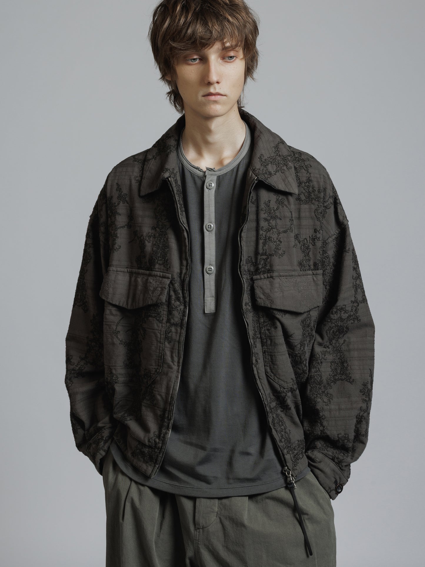・ドビーストライプ地にアールヌーボー調の抽象的な柄を全面刺繍