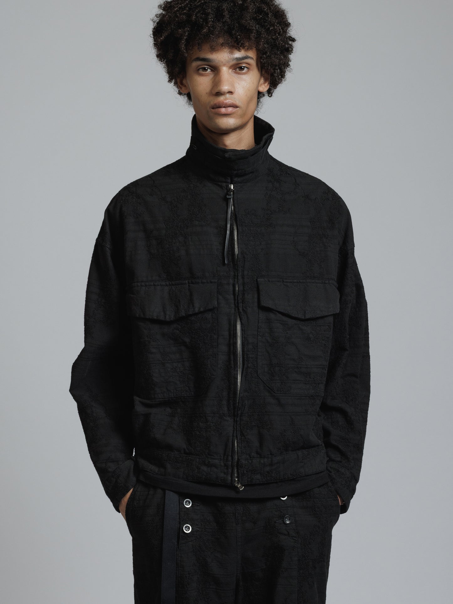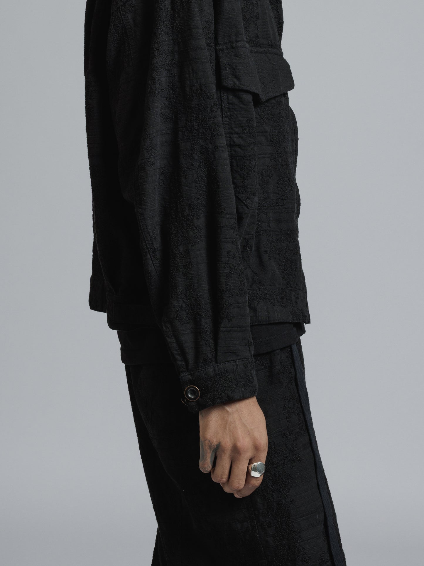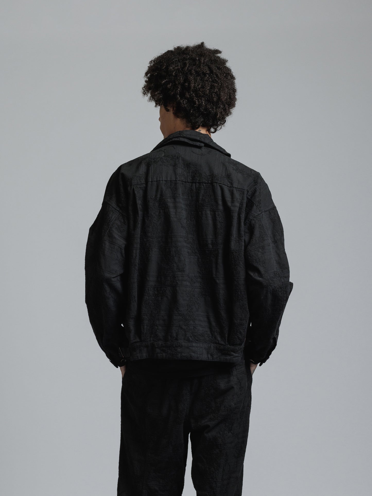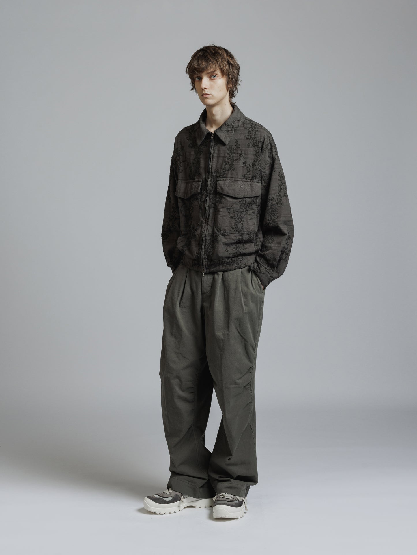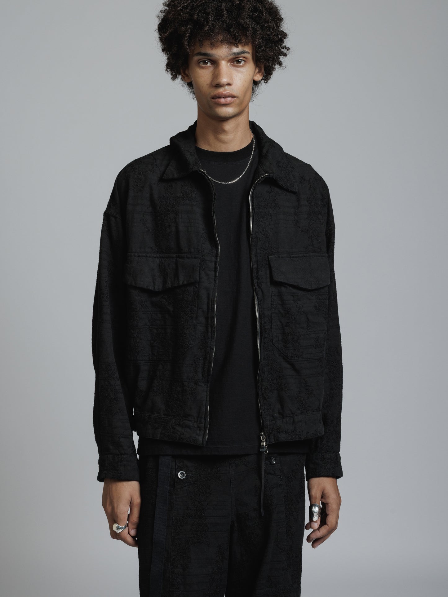 ・ドビーストライプ地にアールヌーボー調の抽象的な柄を全面刺繍