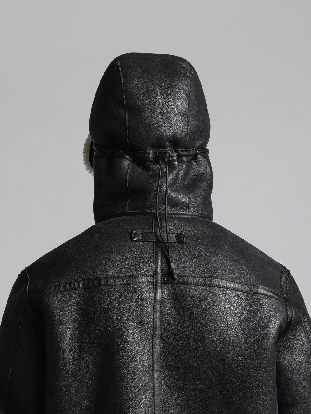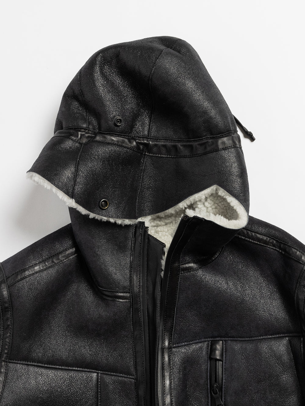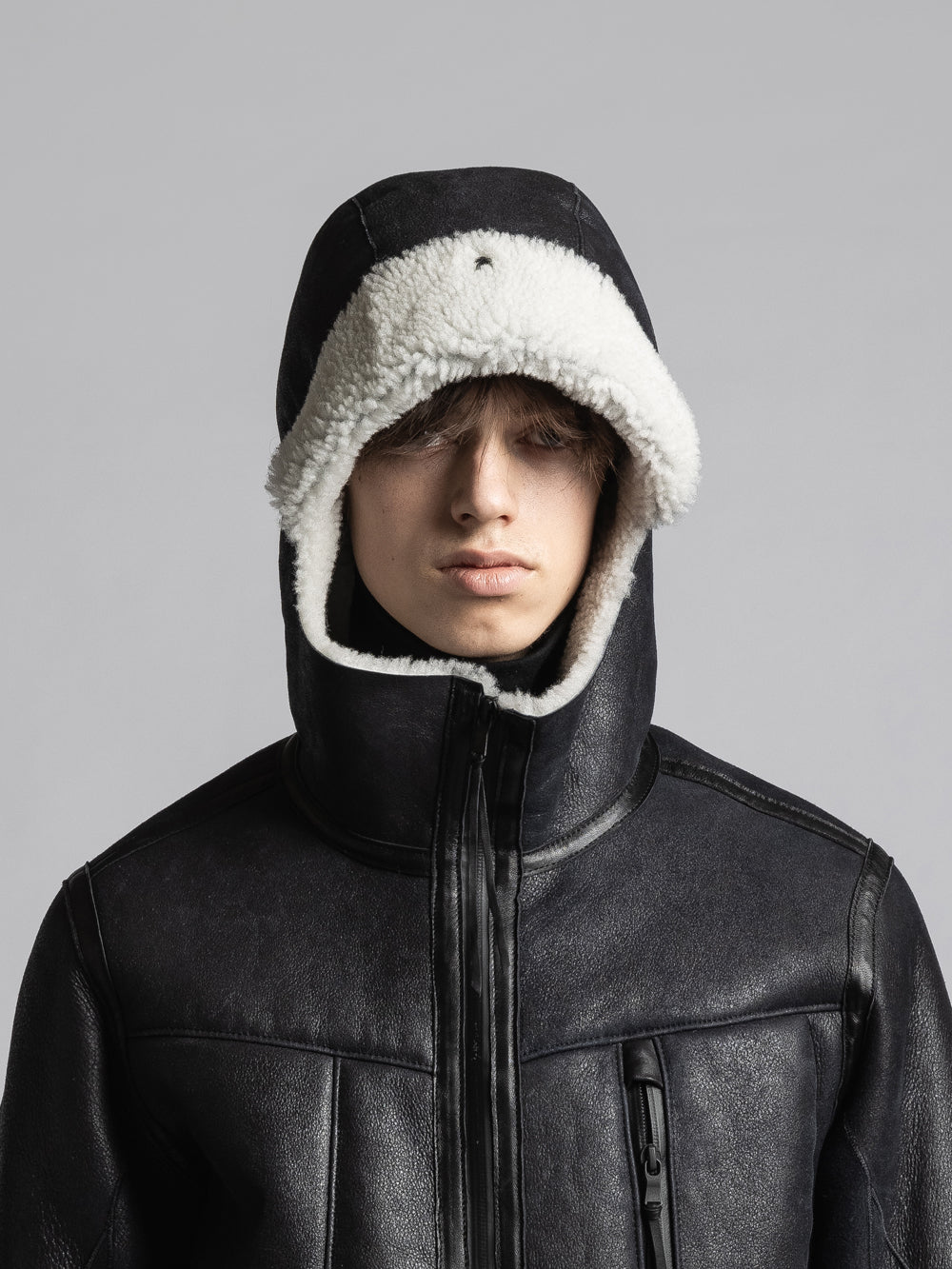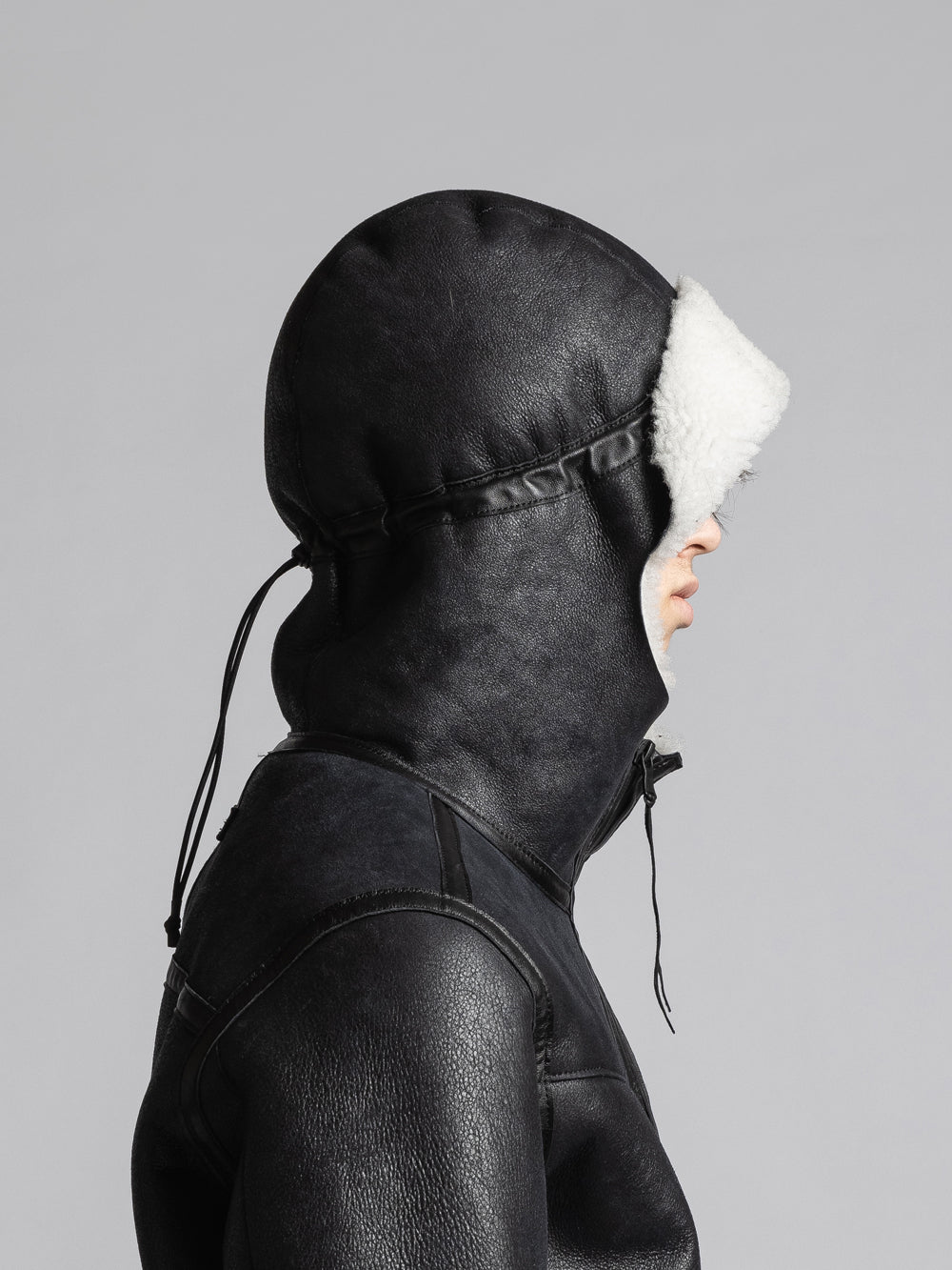 高めのネックと顔が覆い隠れる形のフードでアビエーター風のブルゾンになっています。