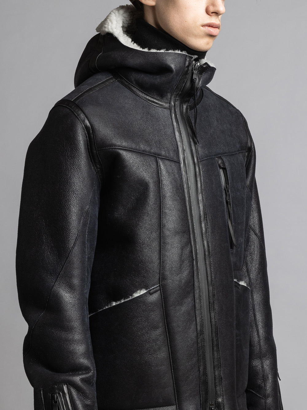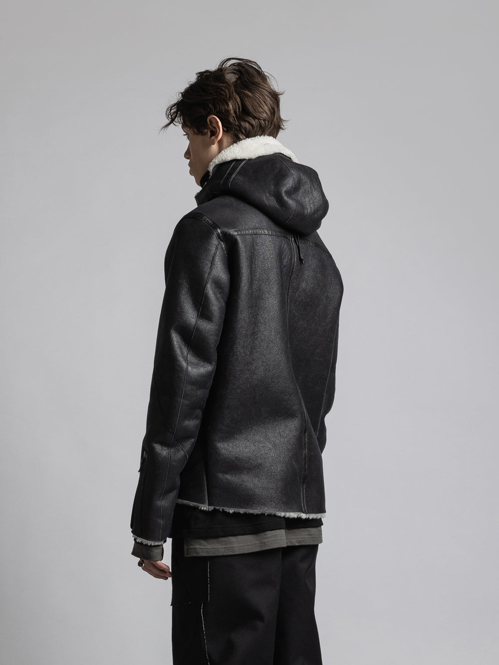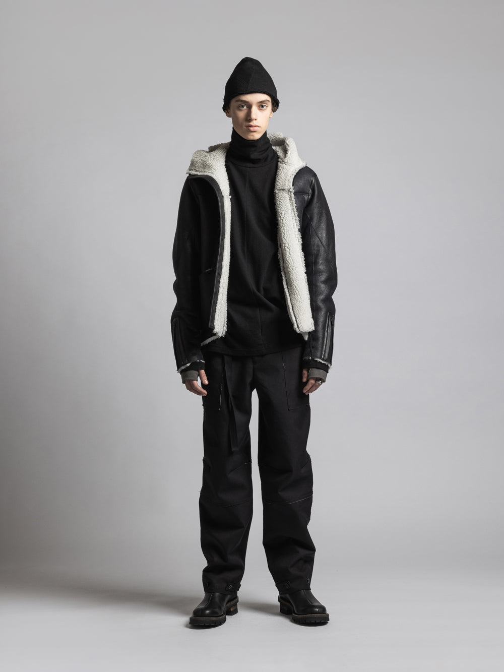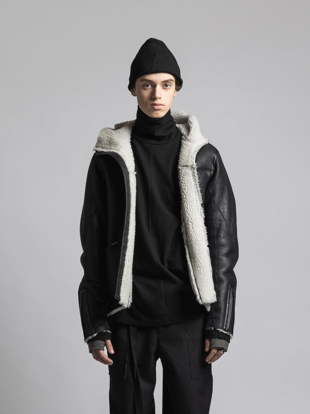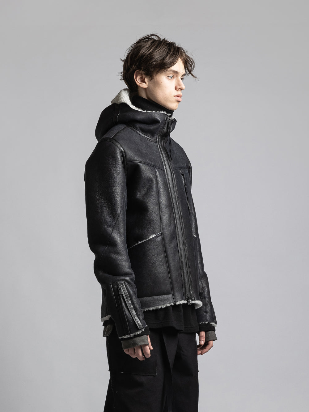 高めのネックと顔が覆い隠れる形のフードでアビエーター風のブルゾンになっています。