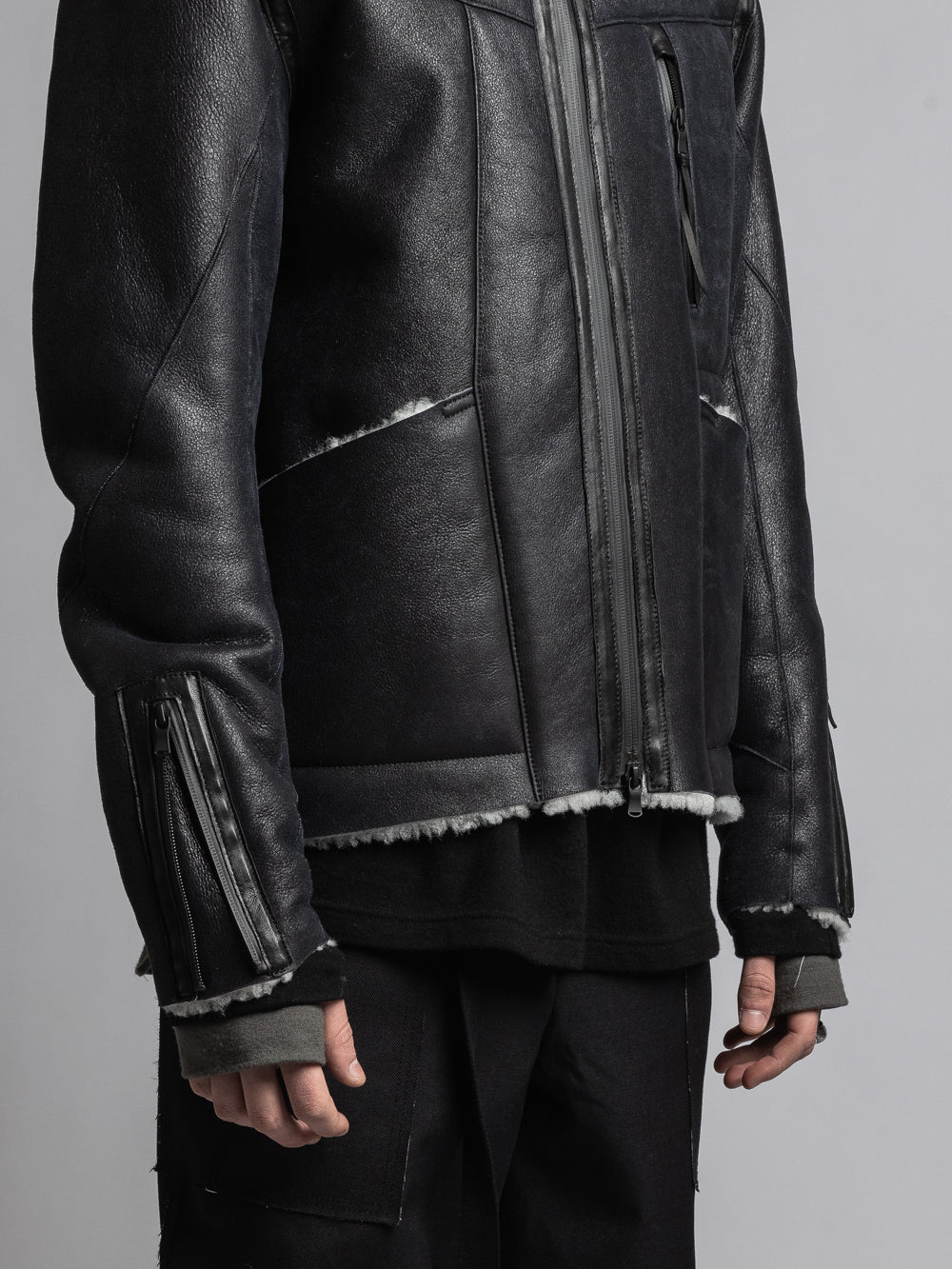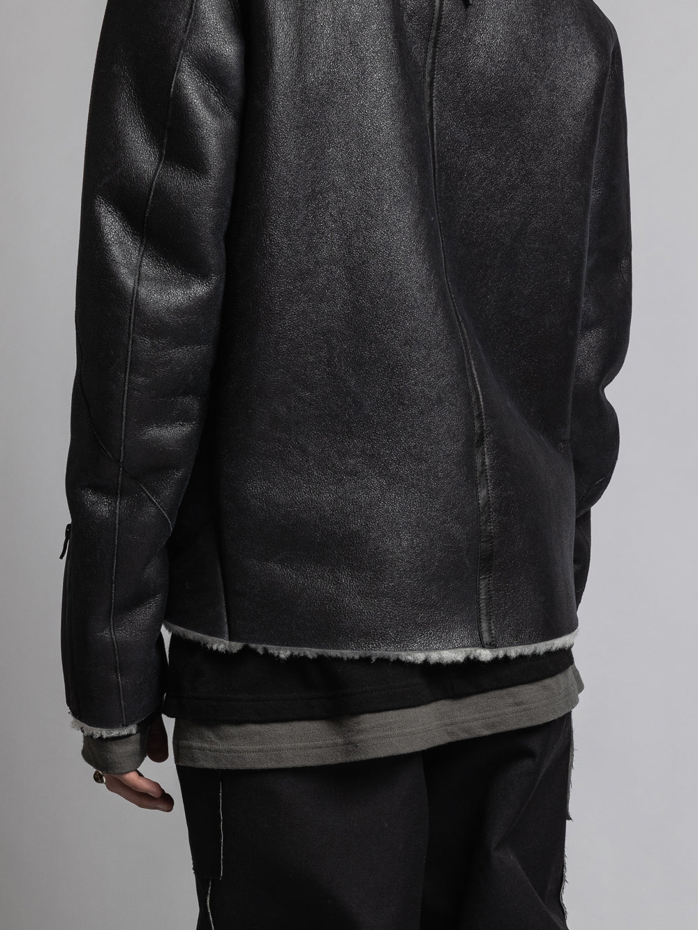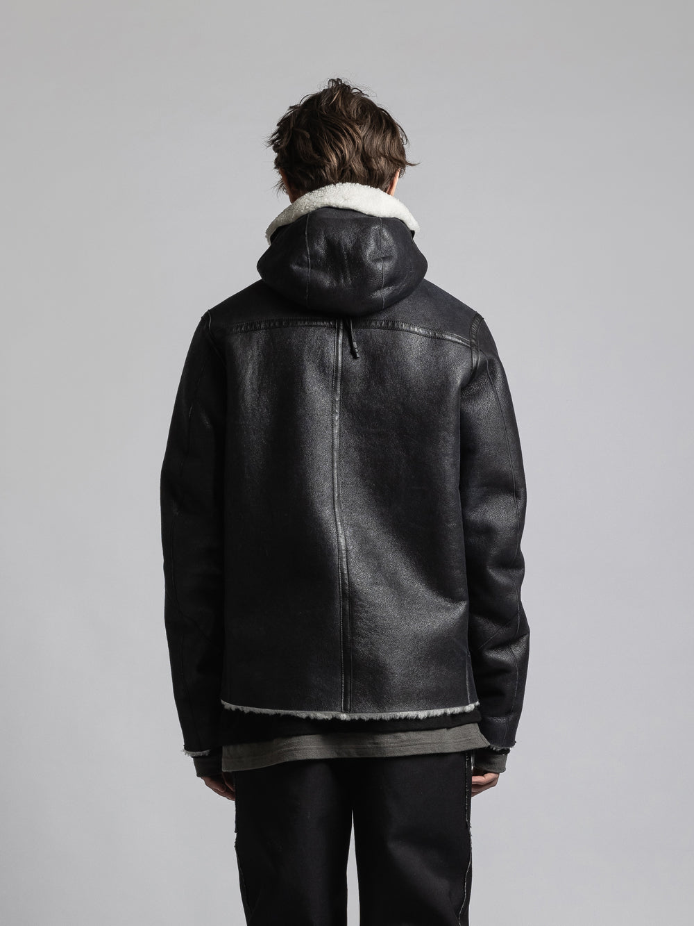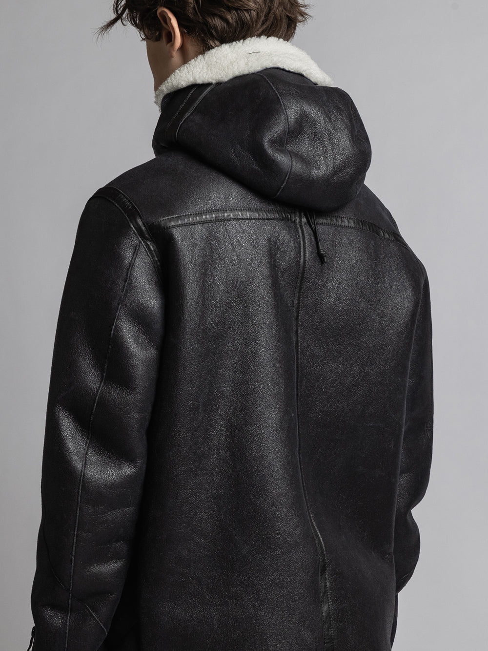 高めのネックと顔が覆い隠れる形のフードでアビエーター風のブルゾンになっています。