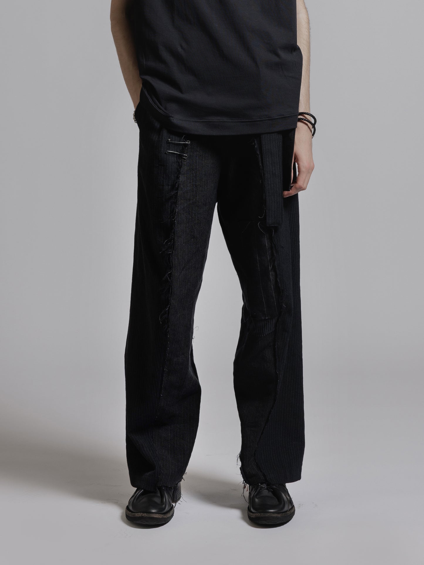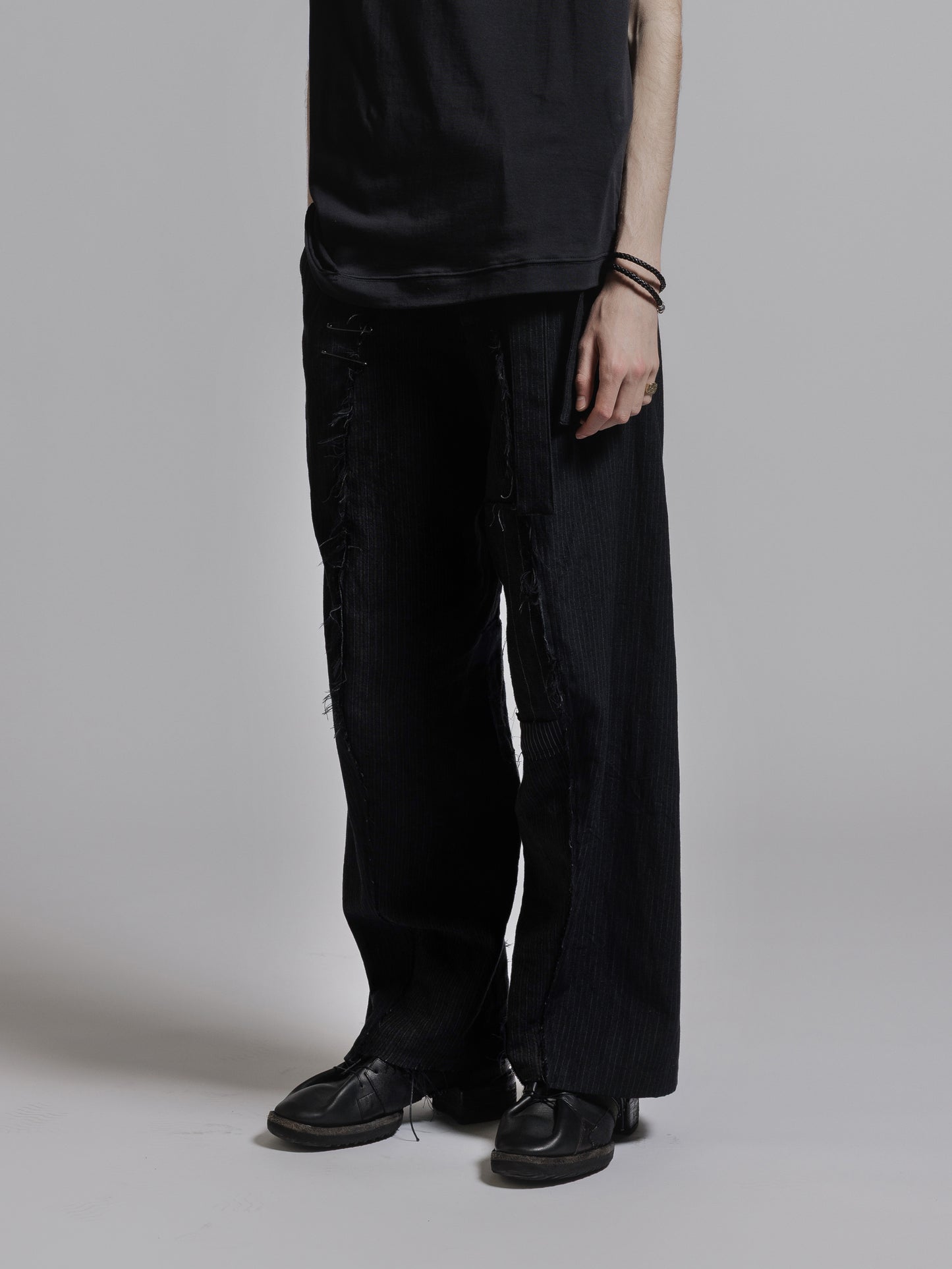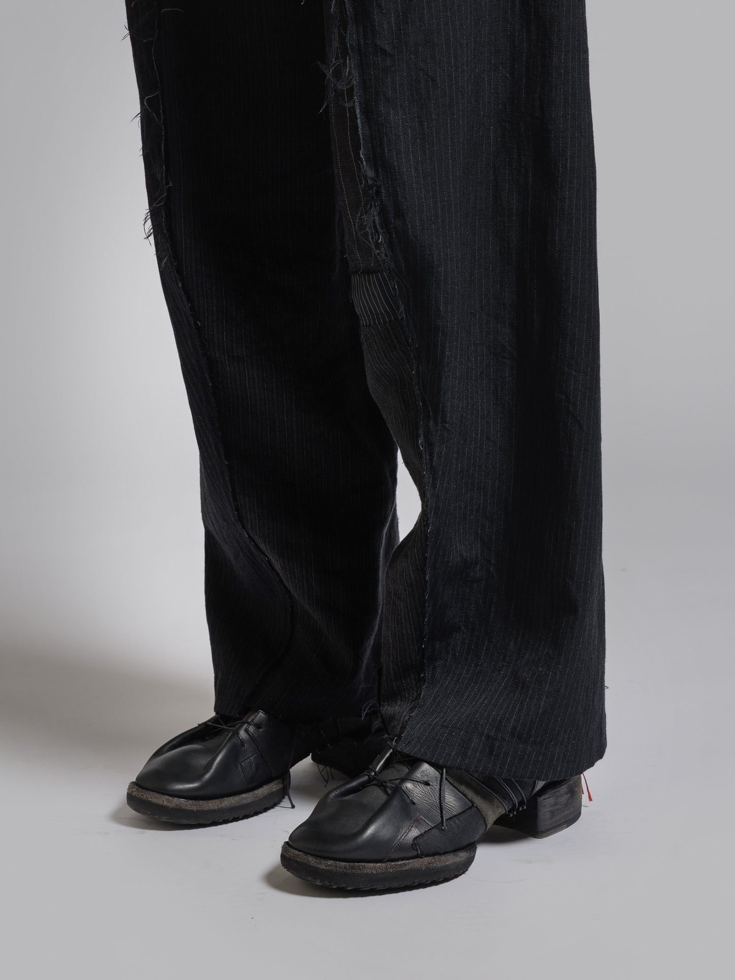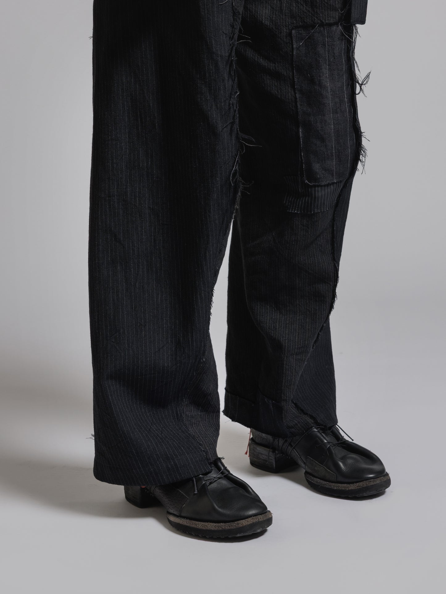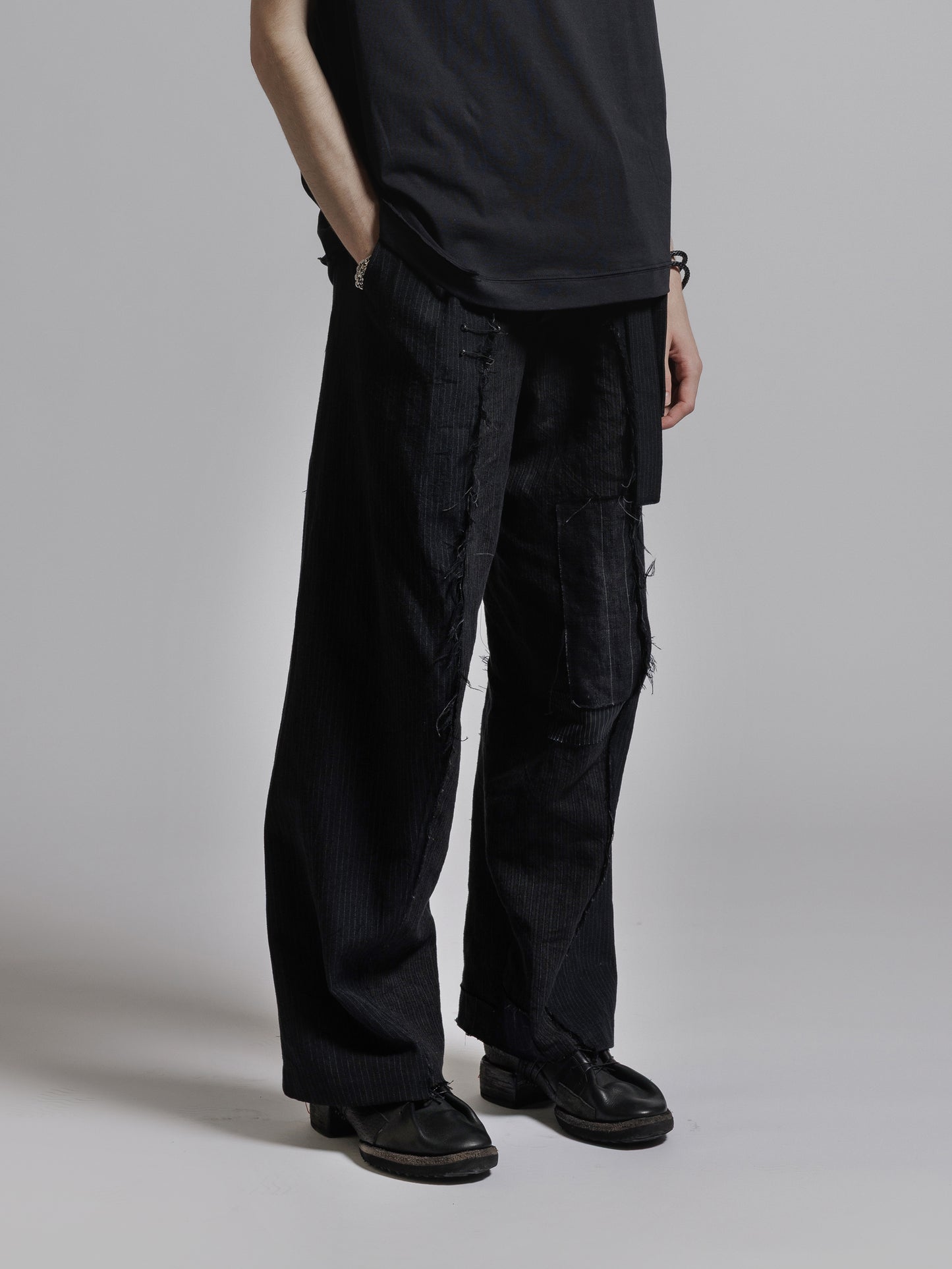 ・パッチワークを施した左右アシンメトリーデザインのワイドパンツ
