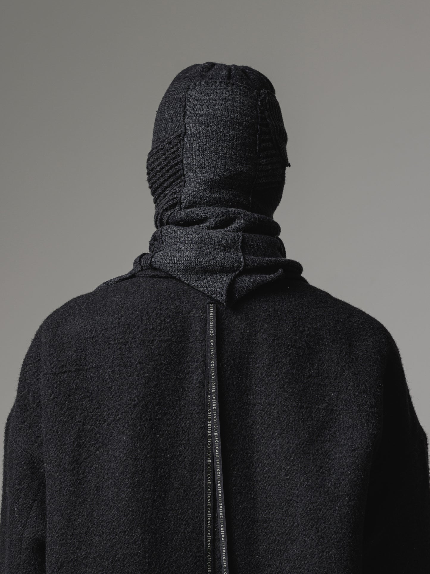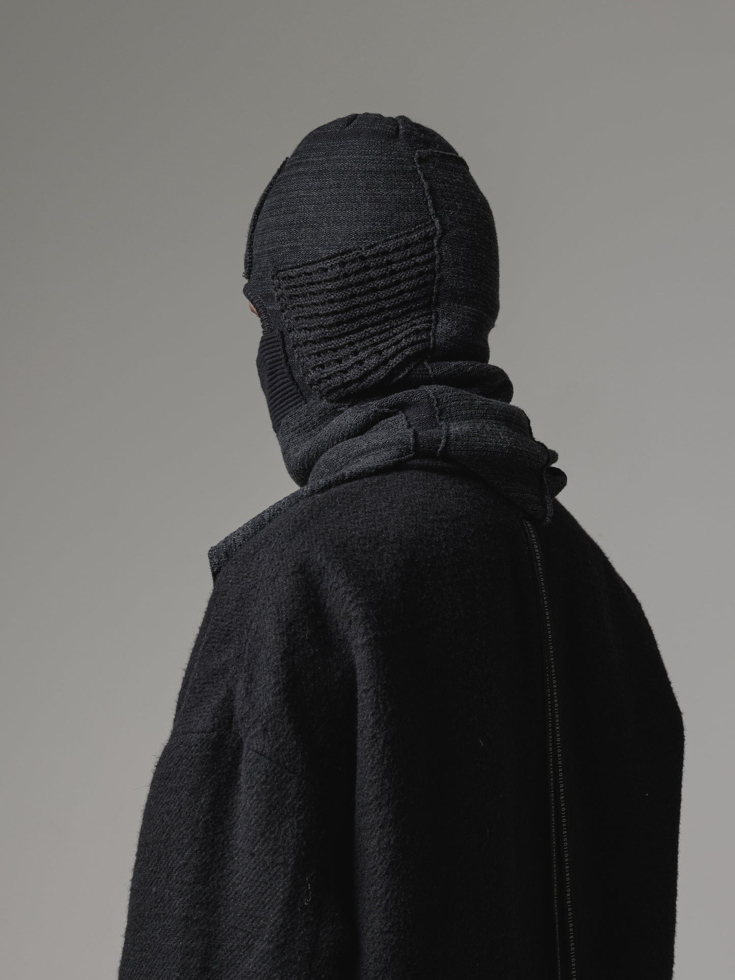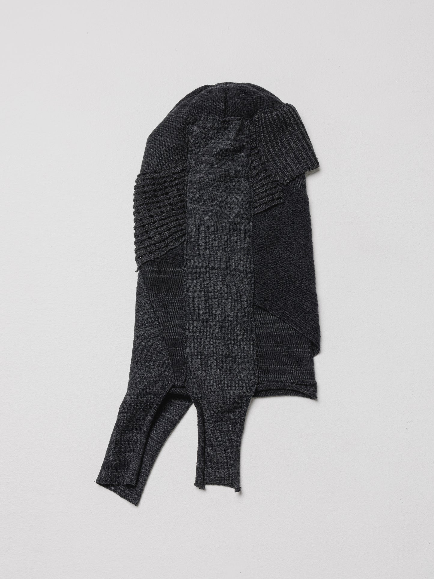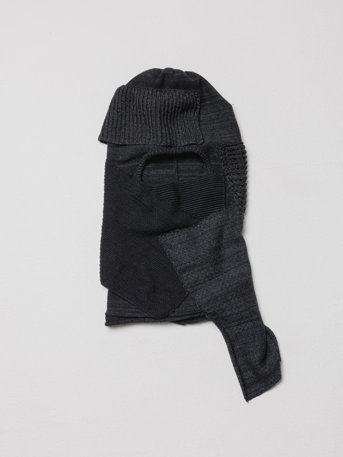 異なる編地をパッチワークのように繋げたバラクラバ。