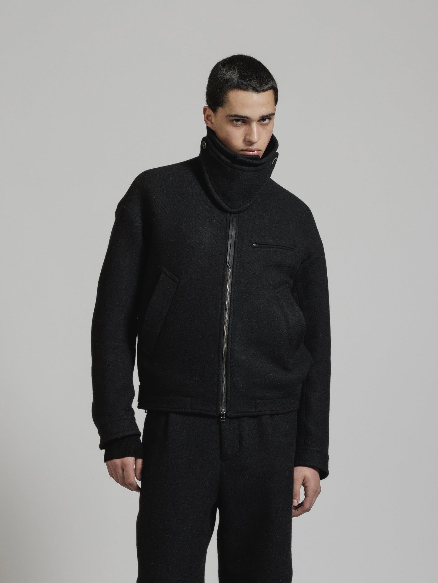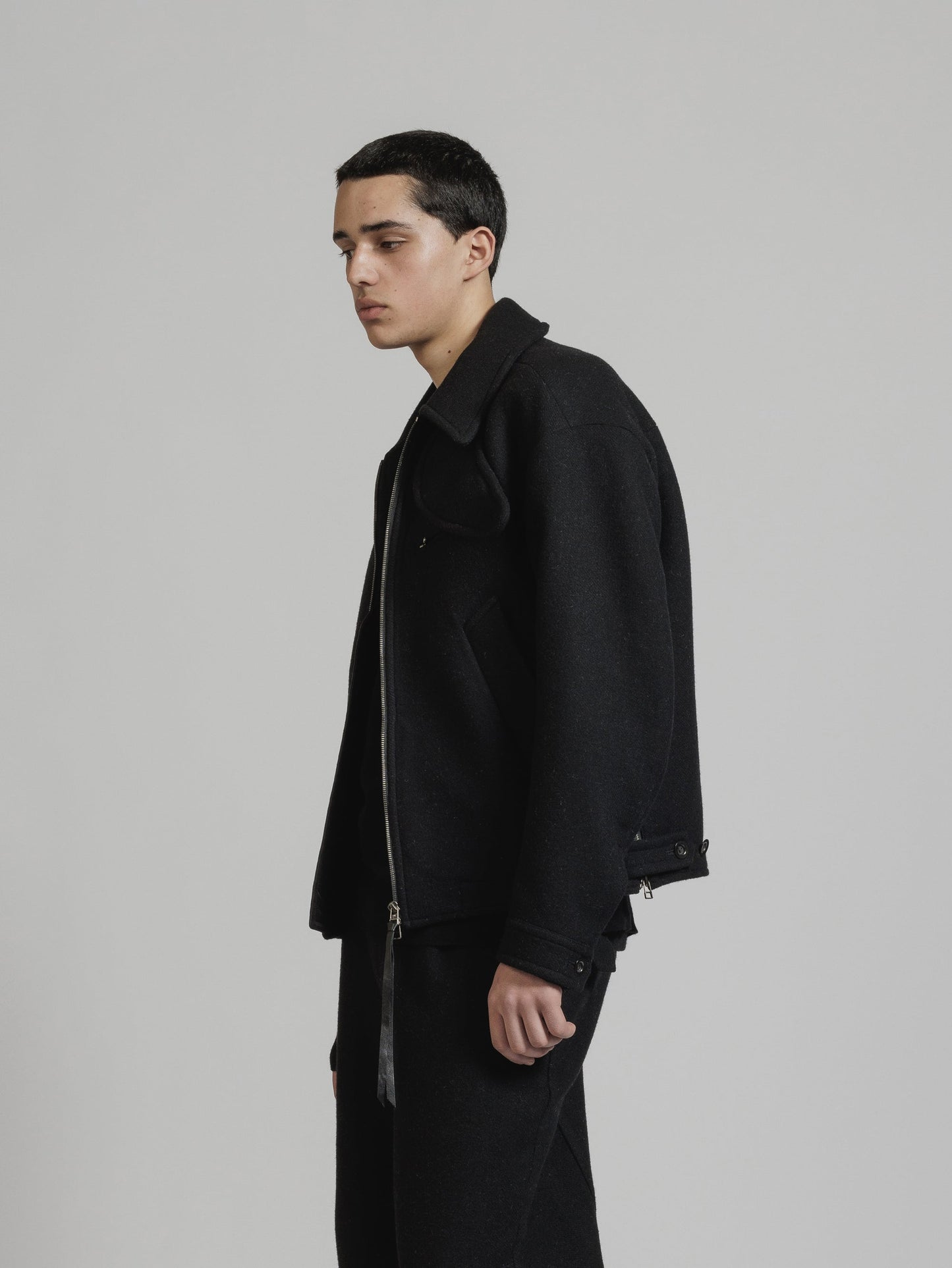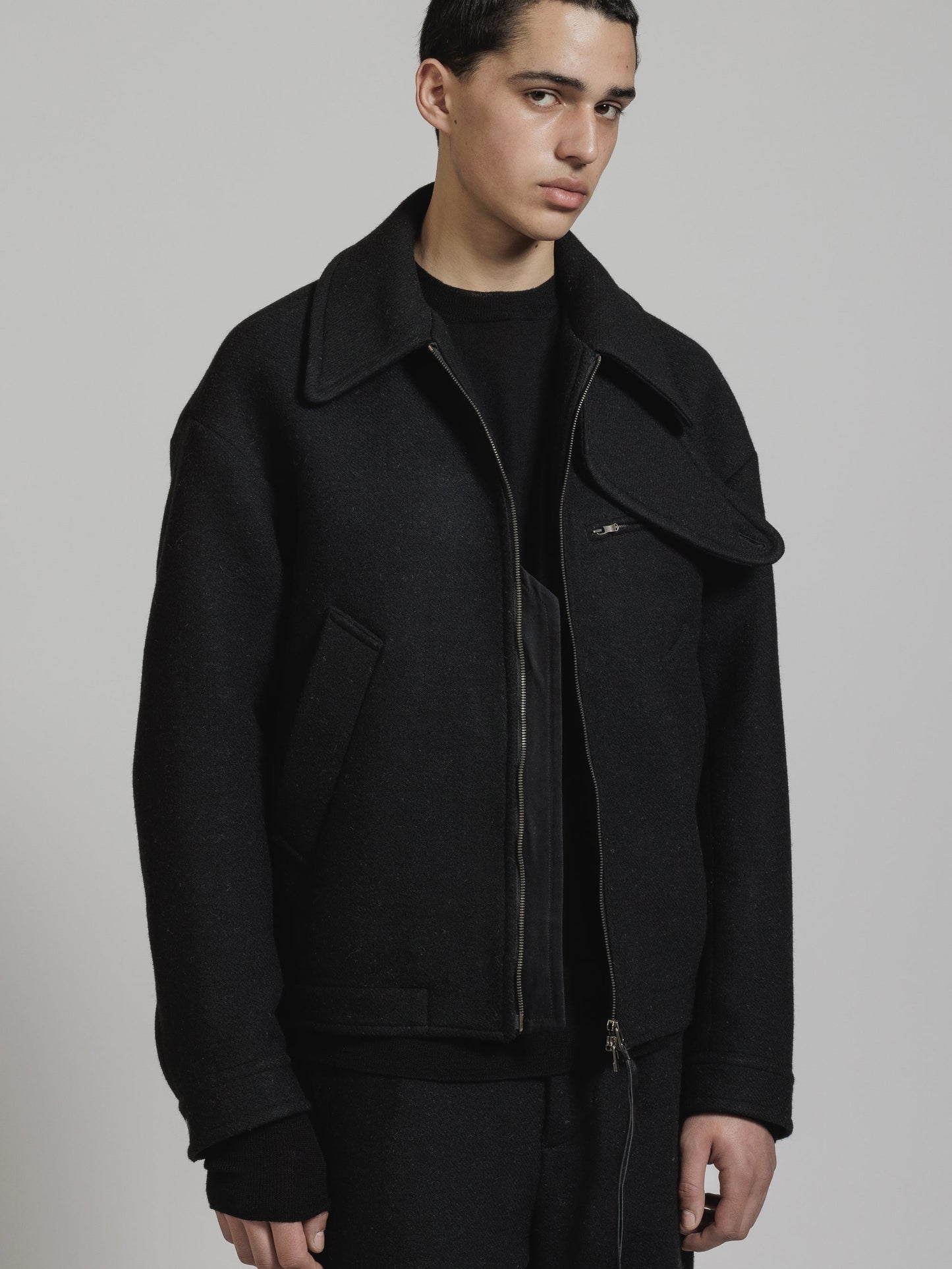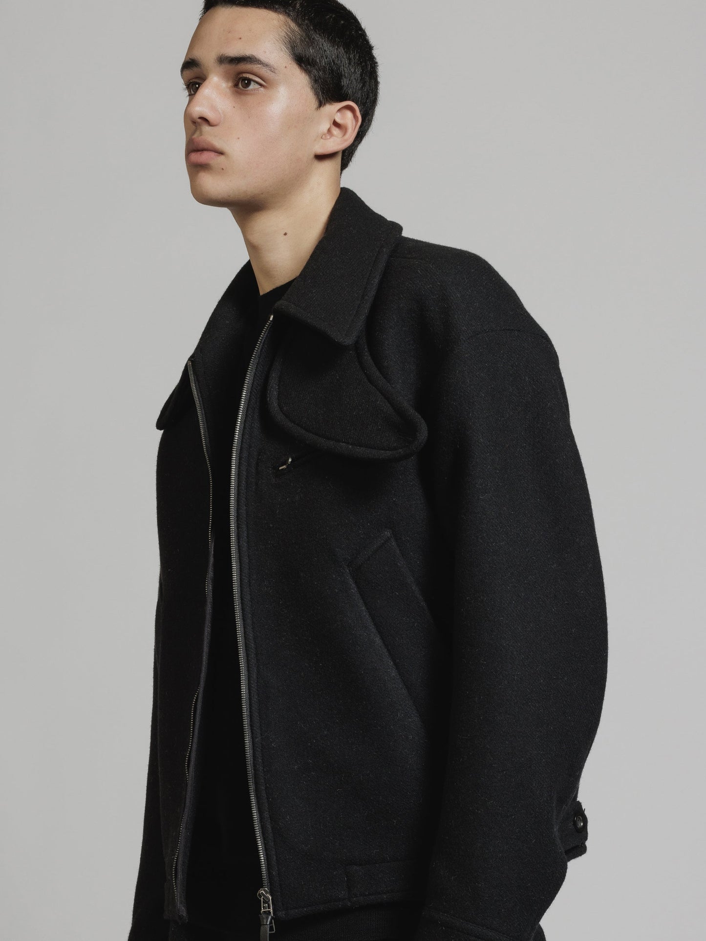 表側無地、裏側ストライプのダブルフェイスメルトン生地を使用したフライトジャケット。