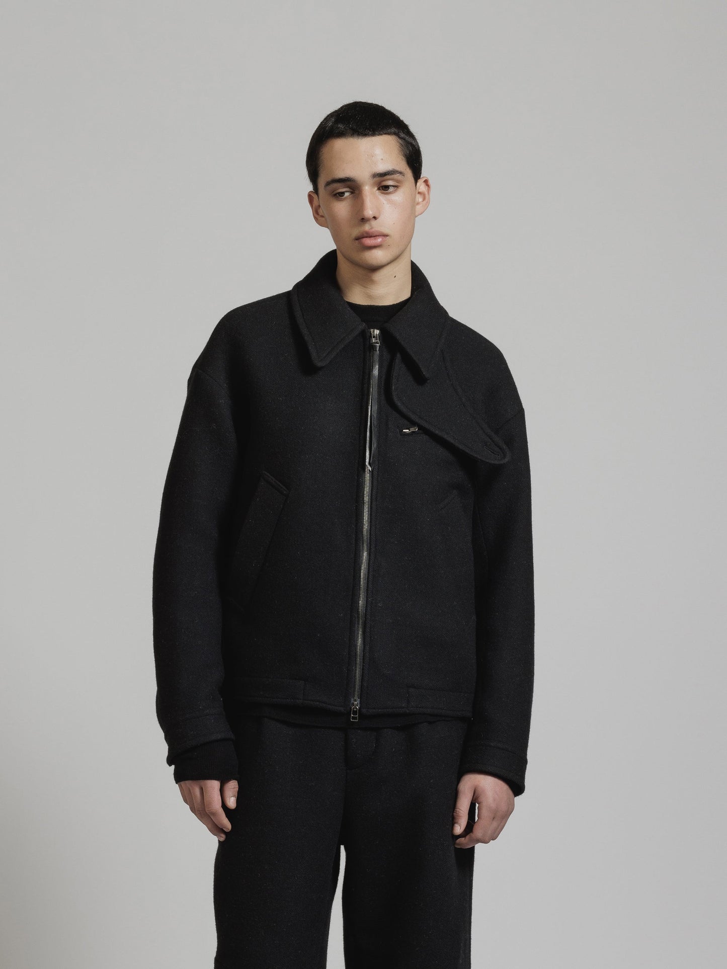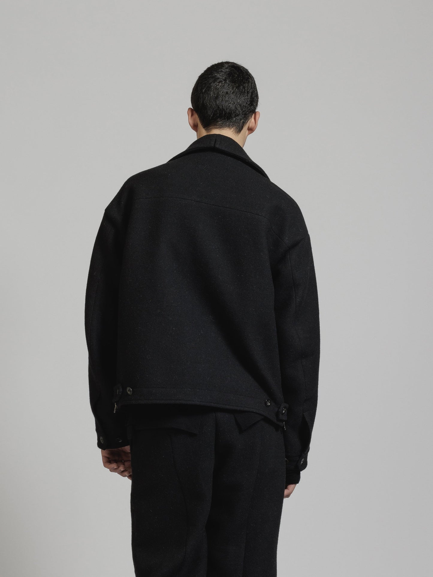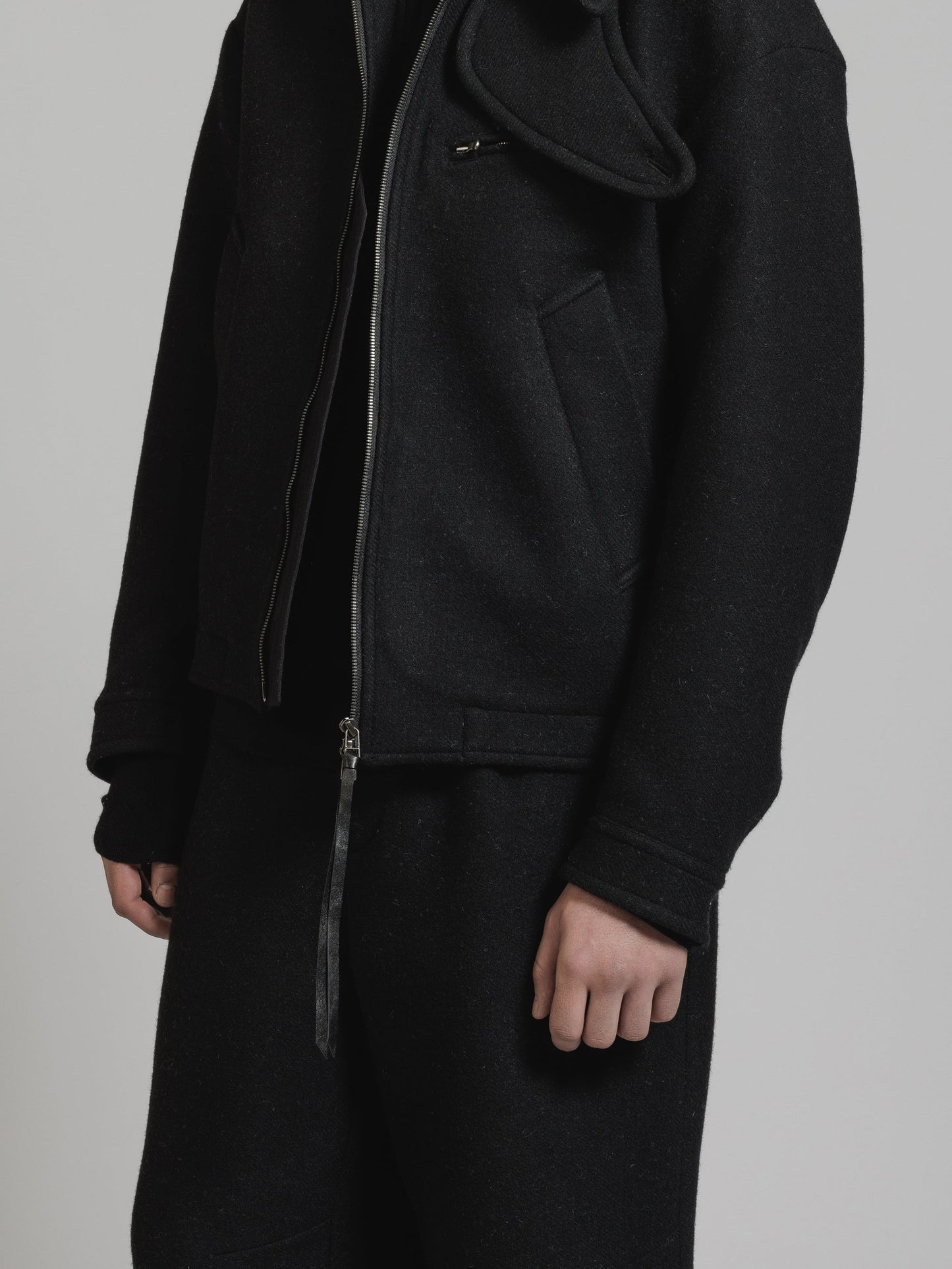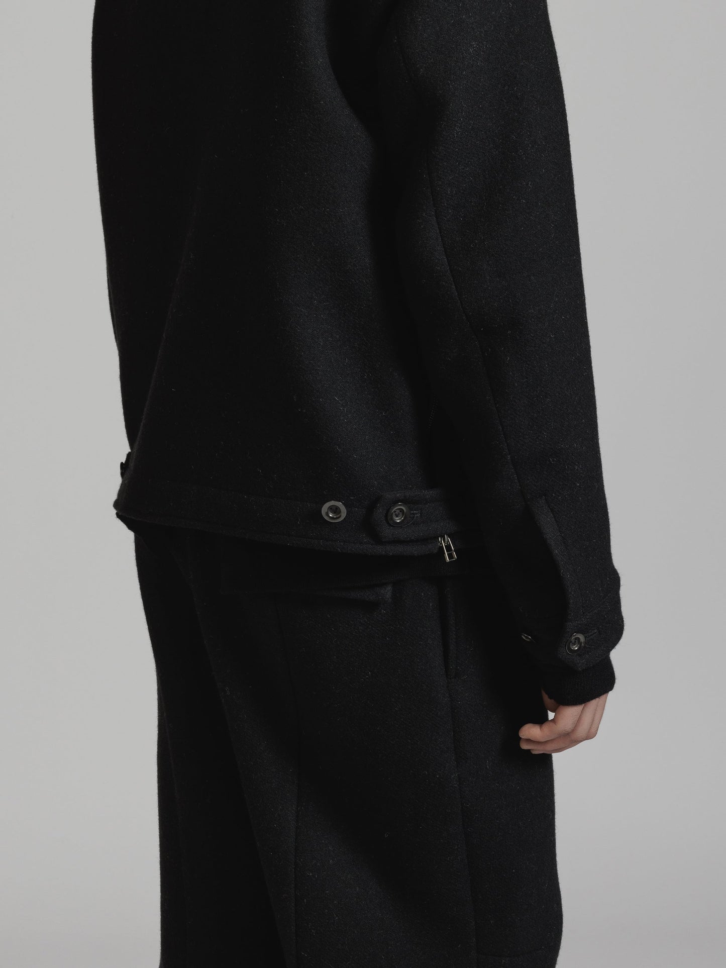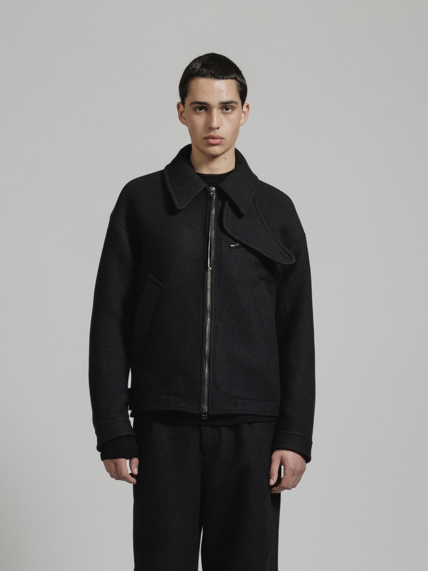 表側無地、裏側ストライプのダブルフェイスメルトン生地を使用したフライトジャケット。