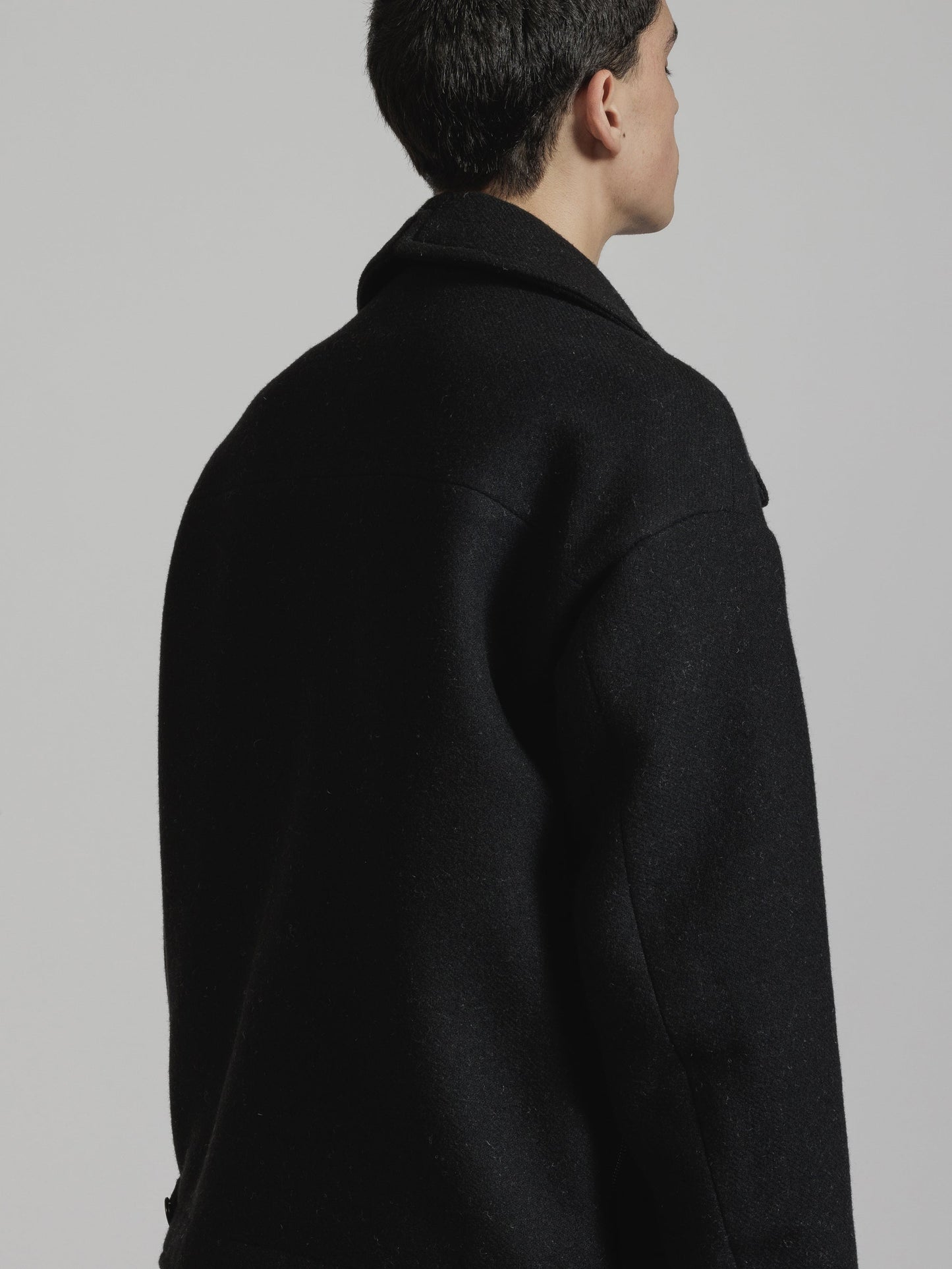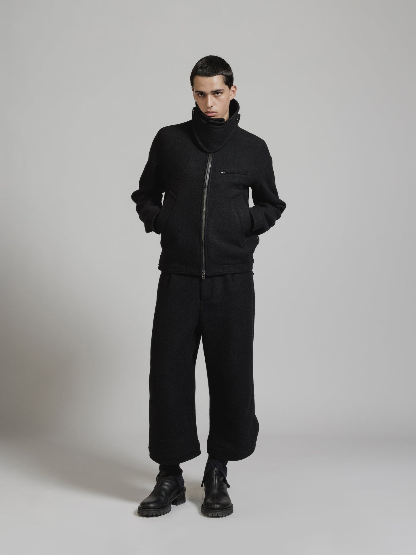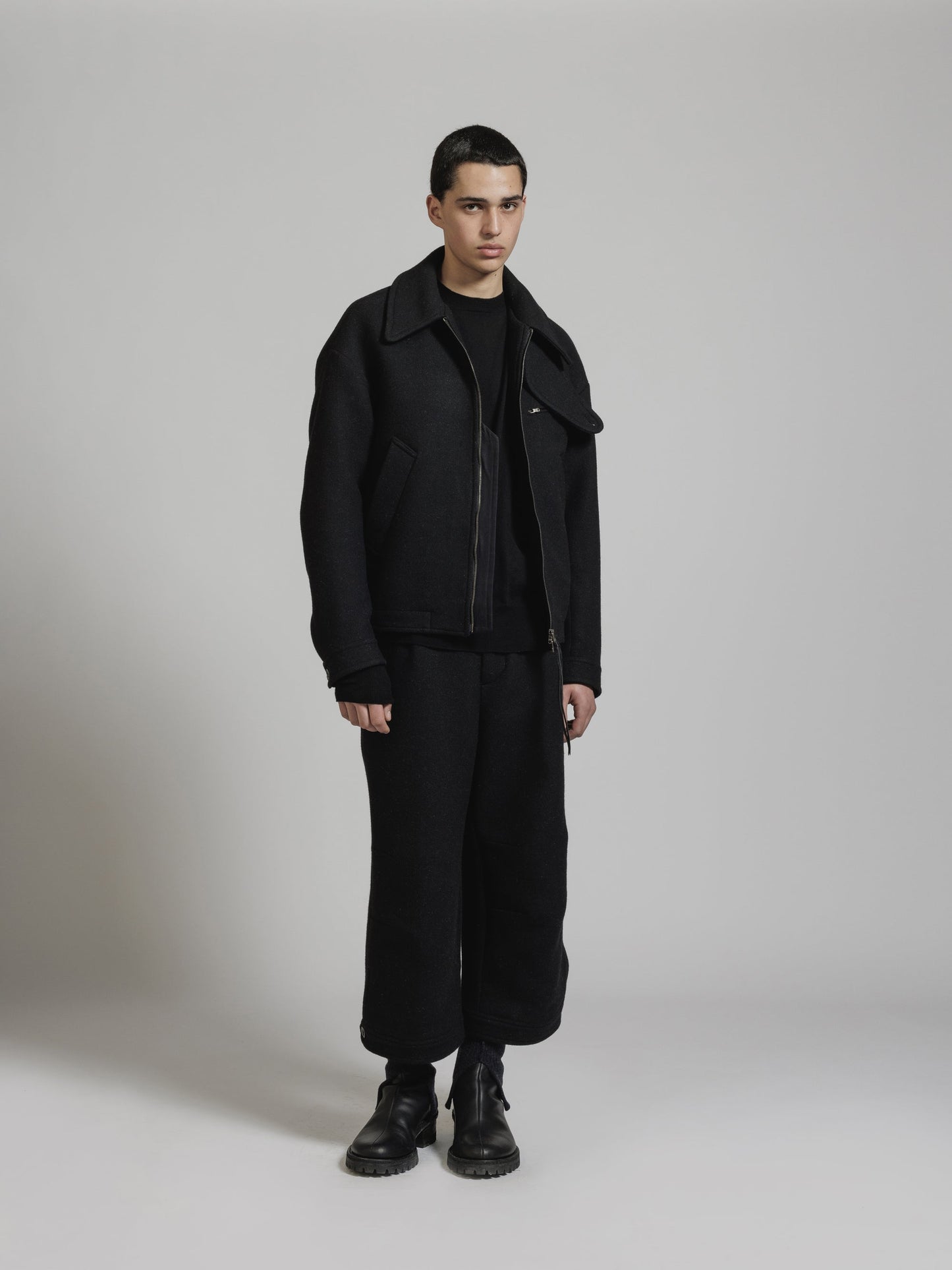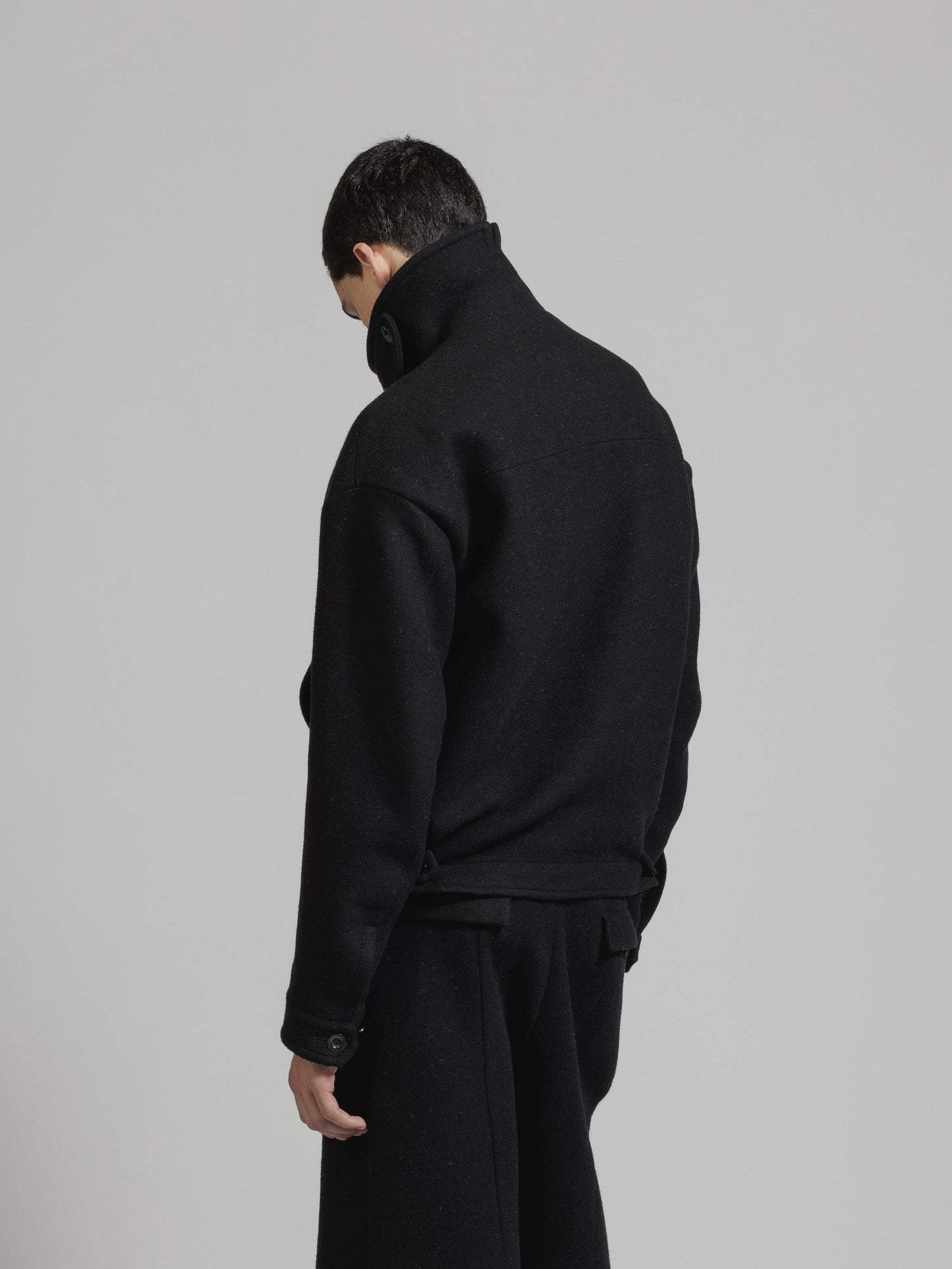 表側無地、裏側ストライプのダブルフェイスメルトン生地を使用したフライトジャケット。