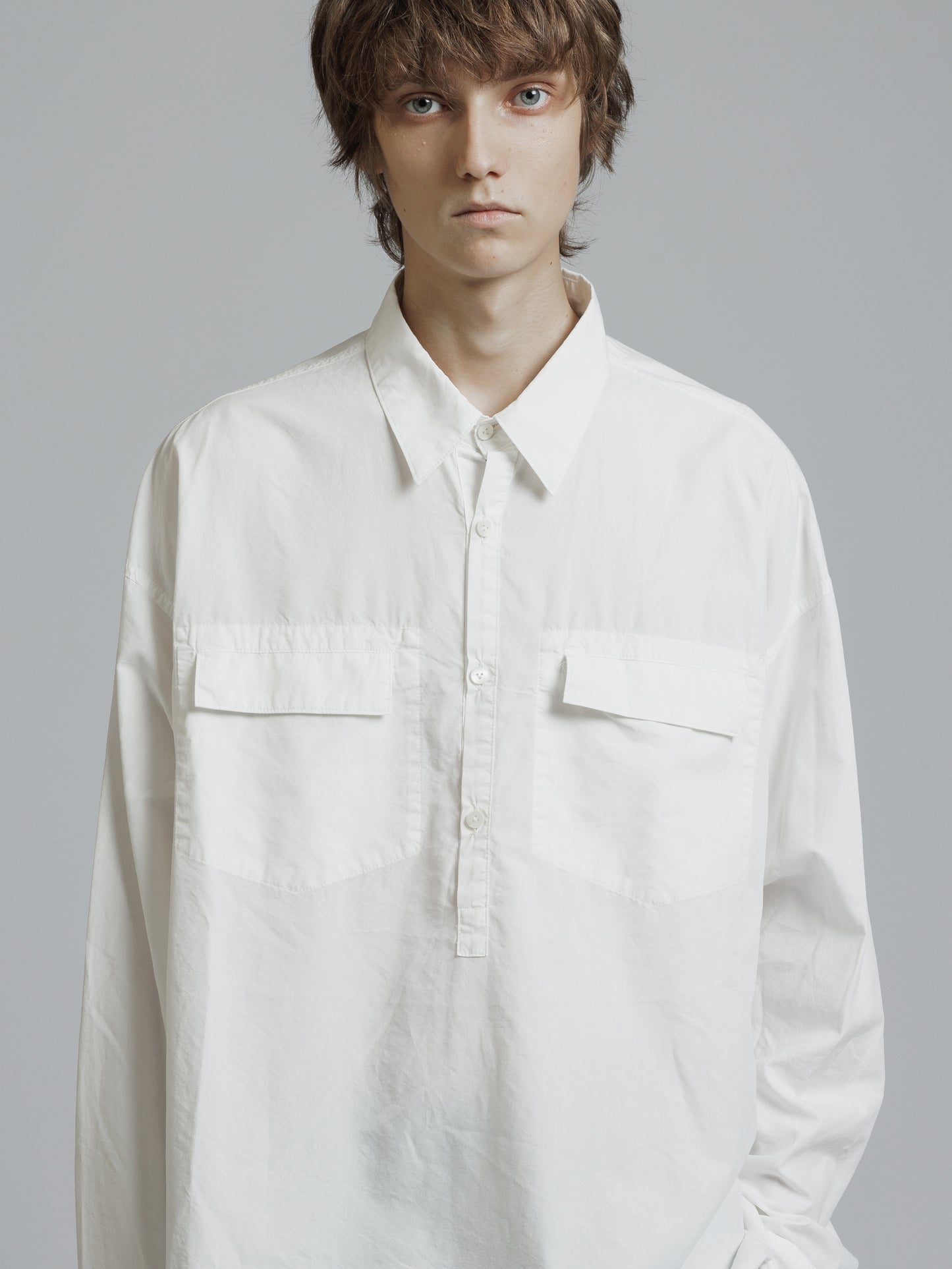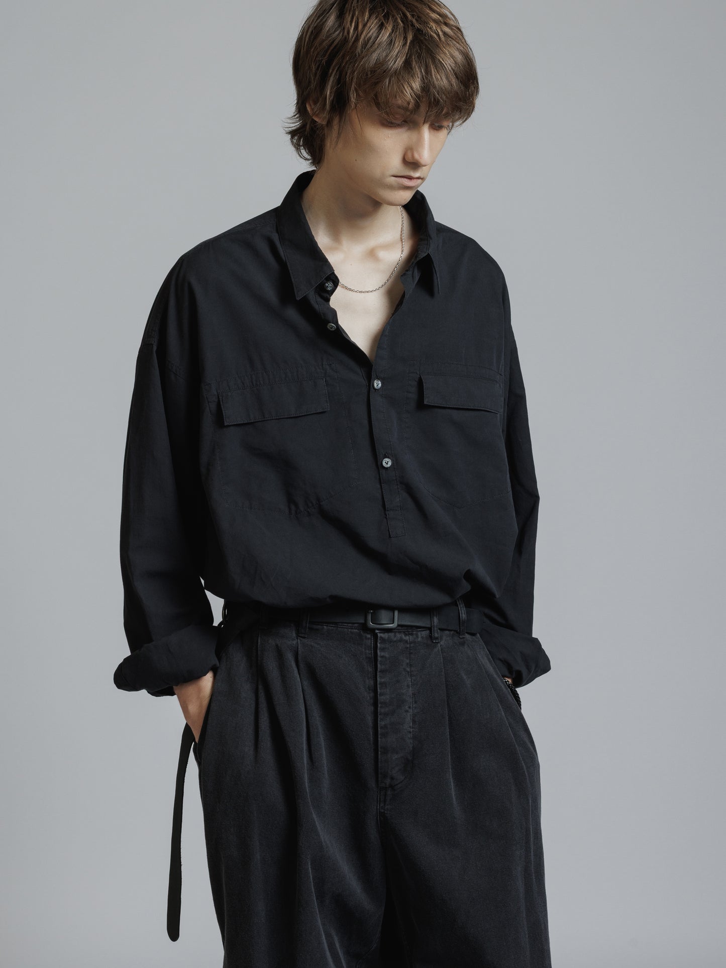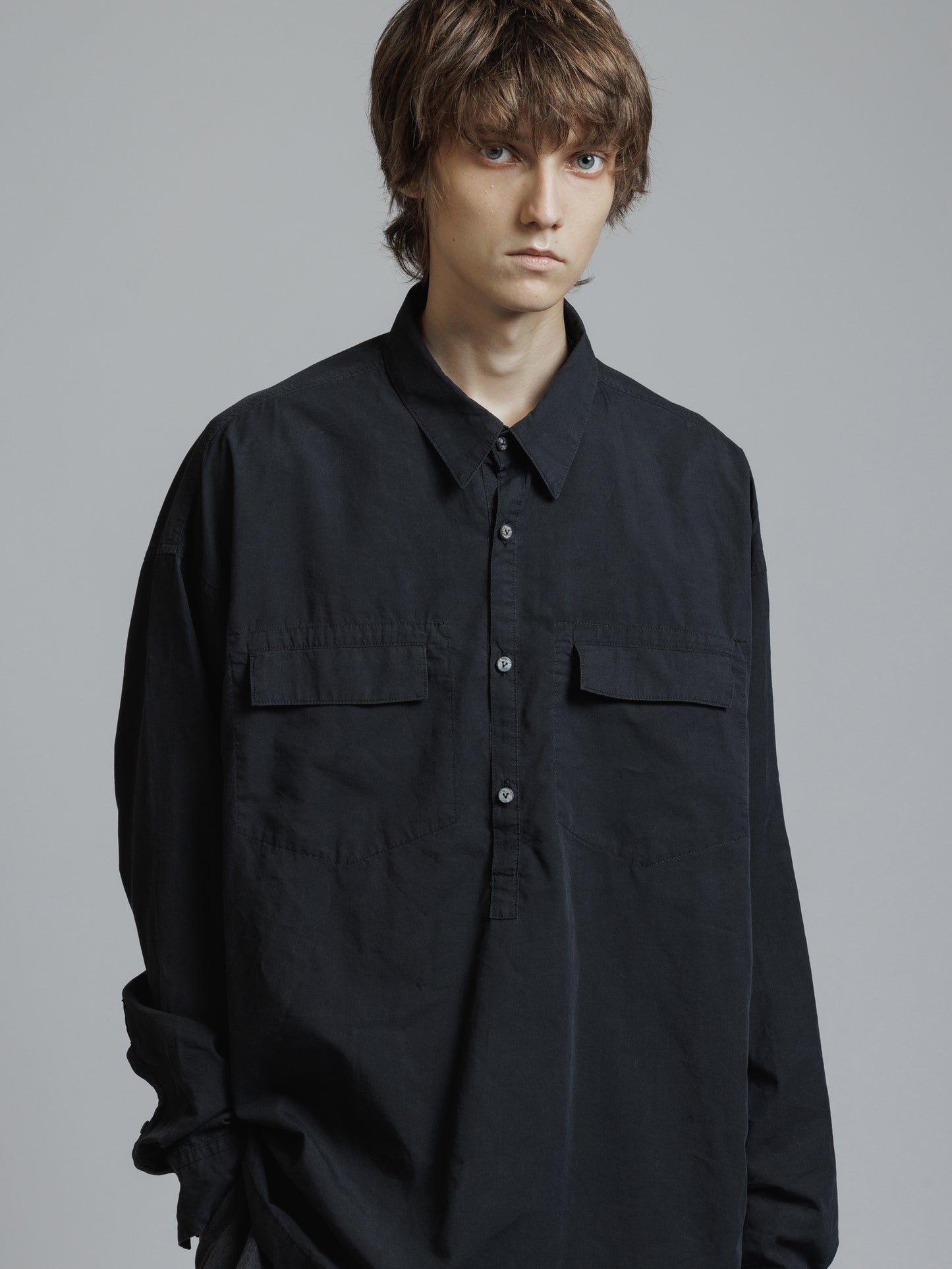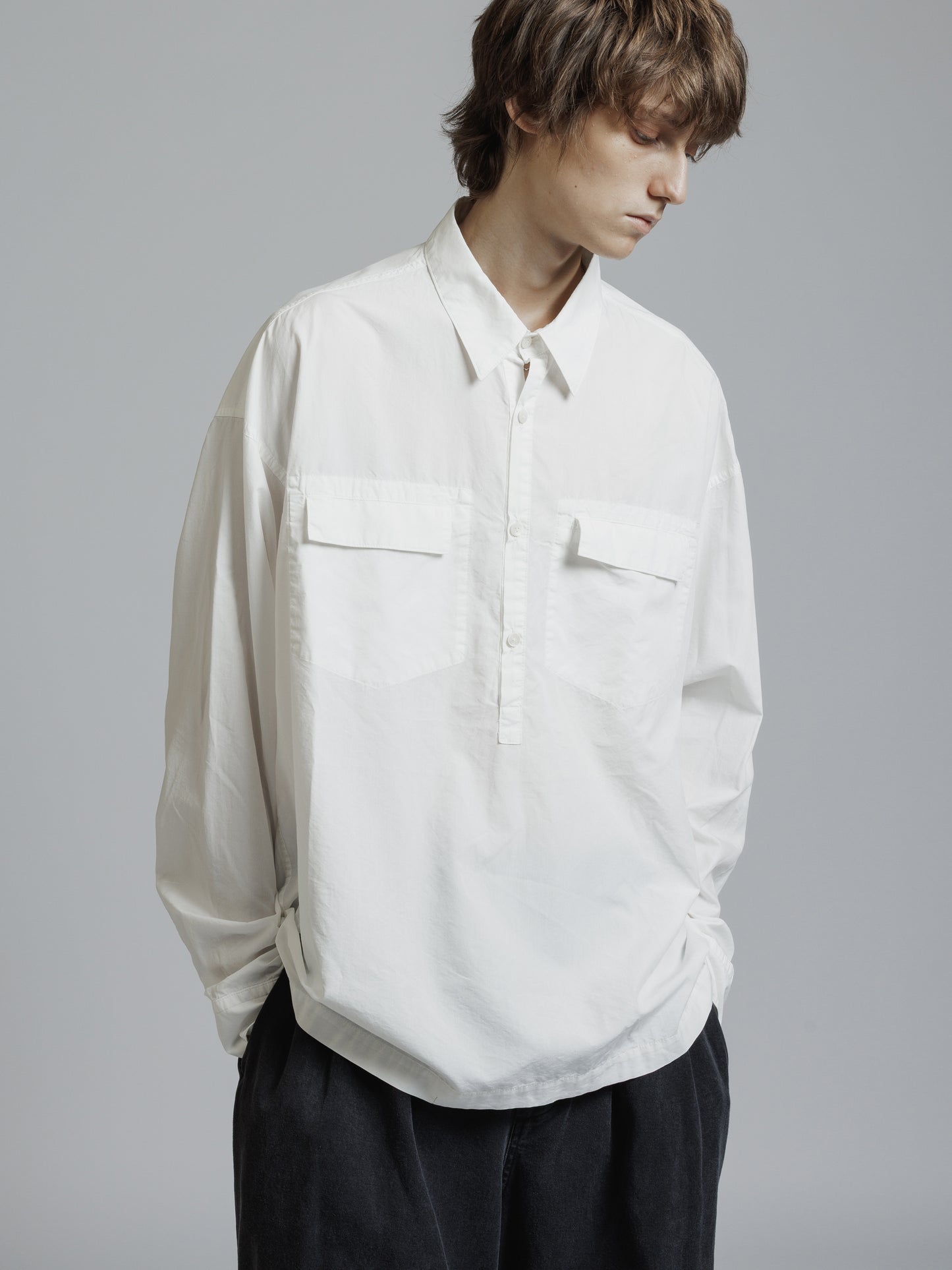・フロント上部釦明きの長袖シャツ