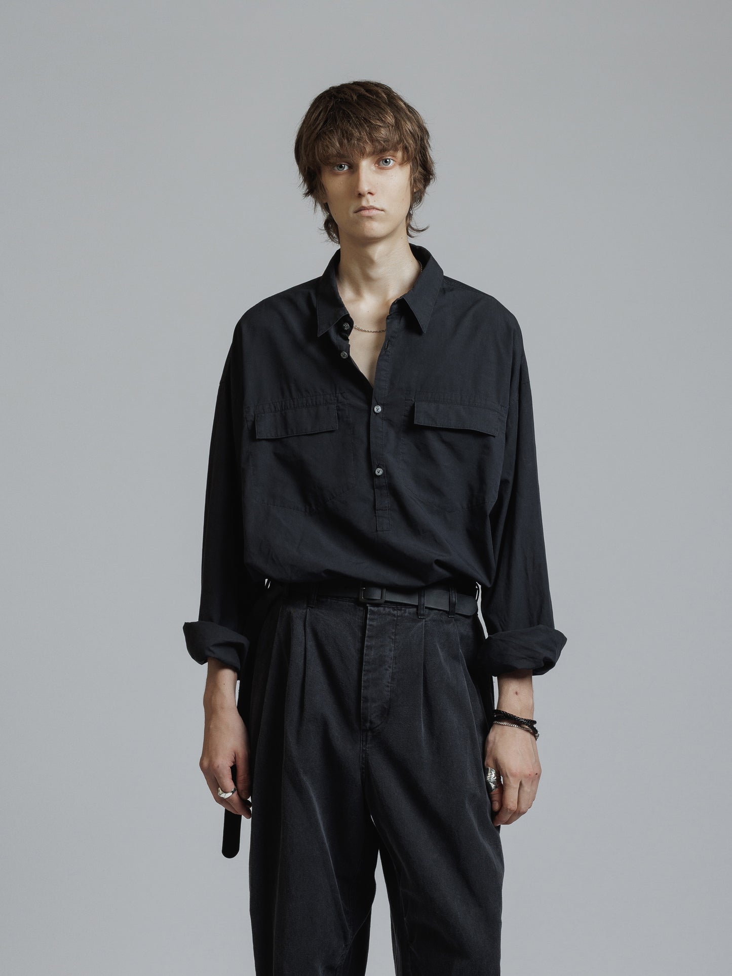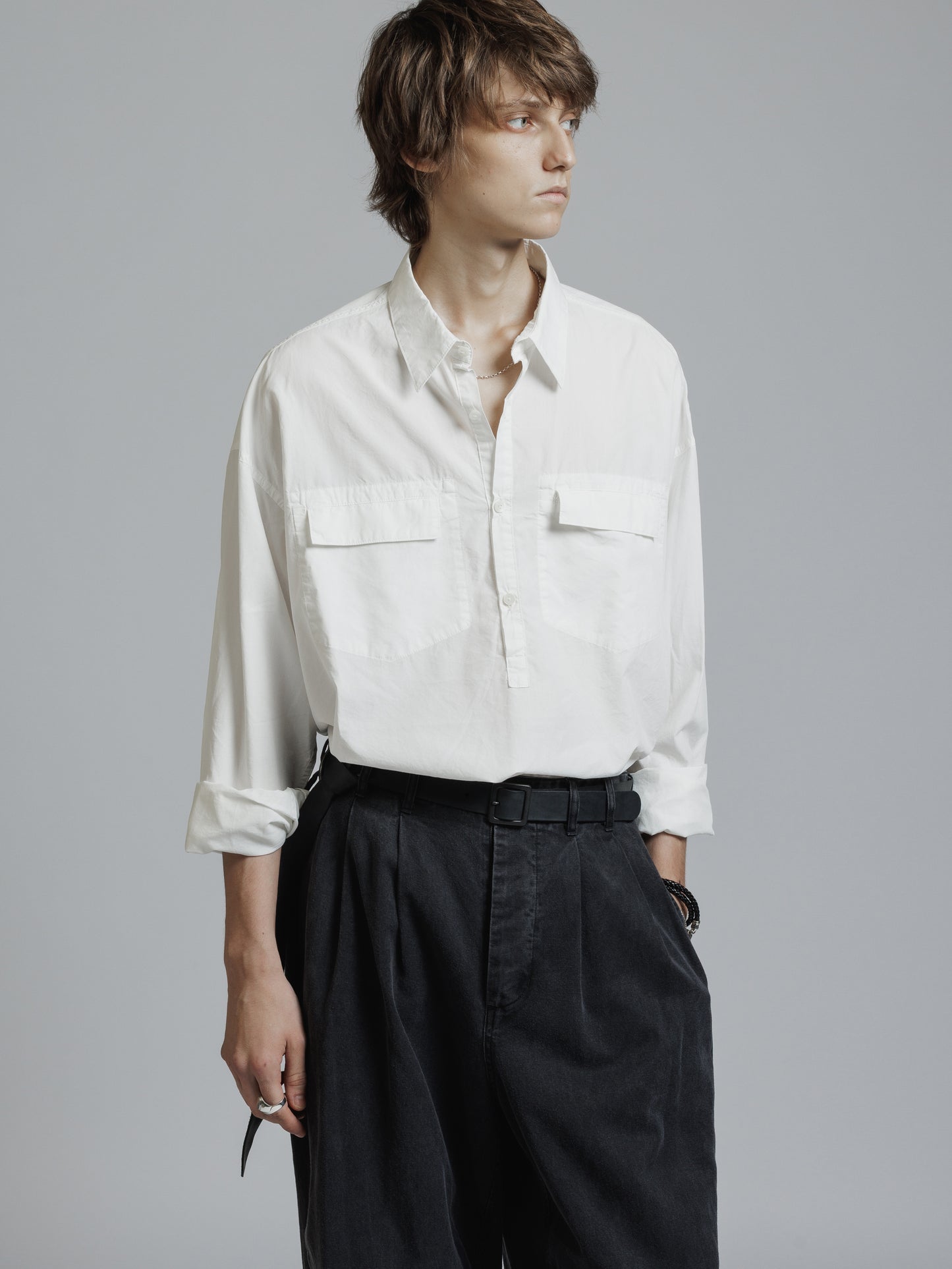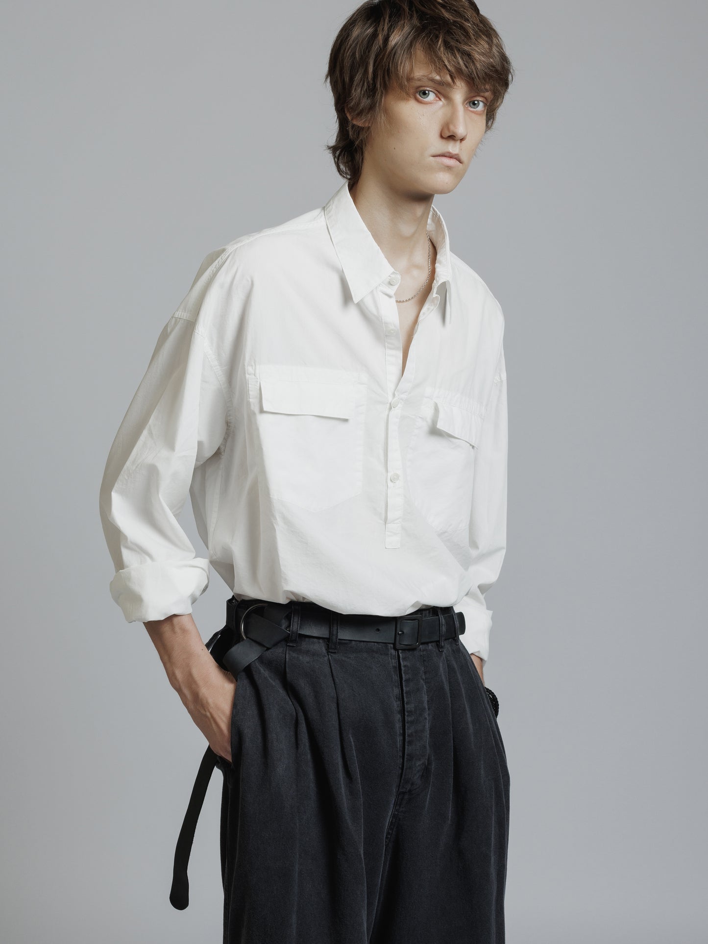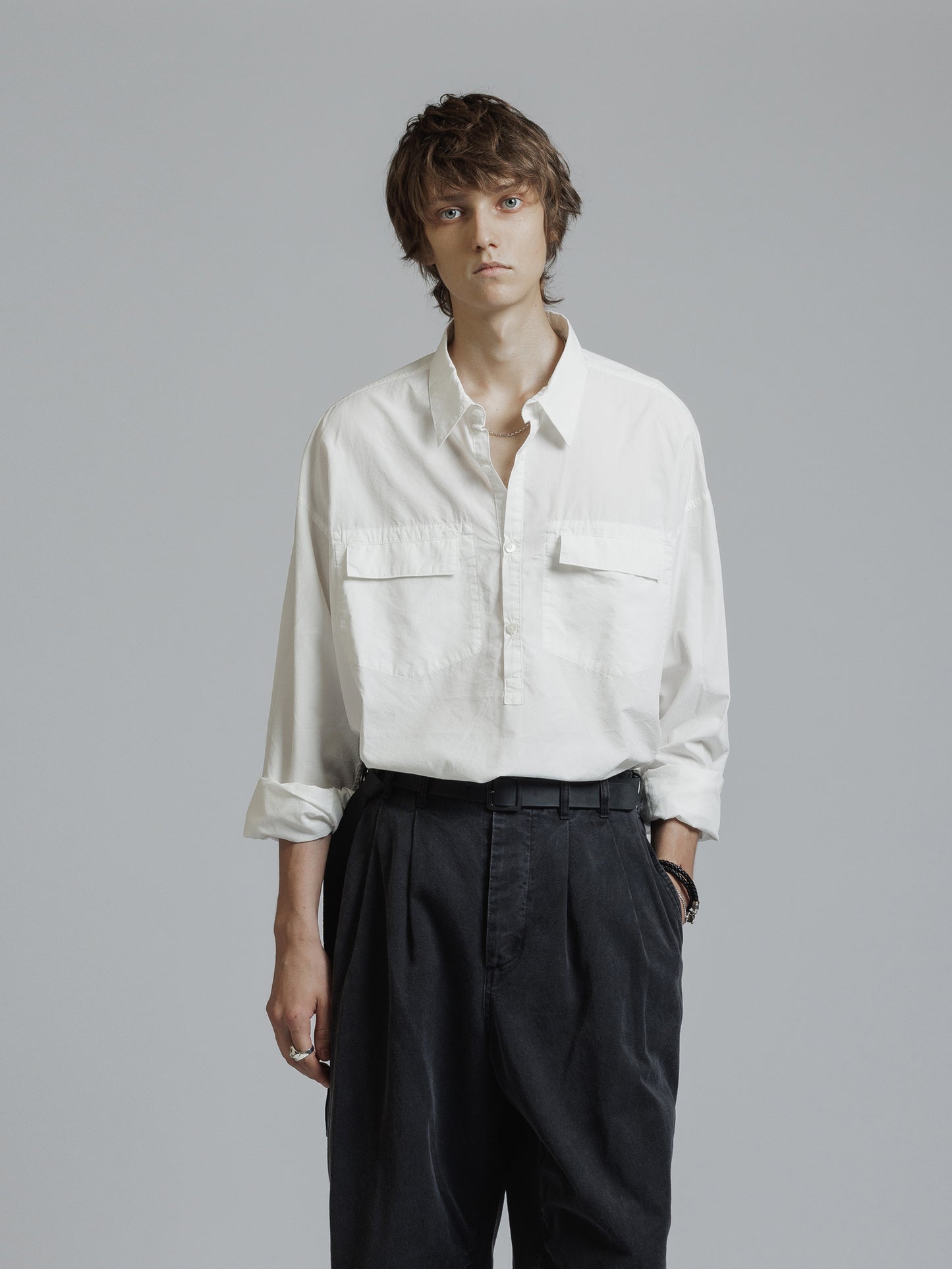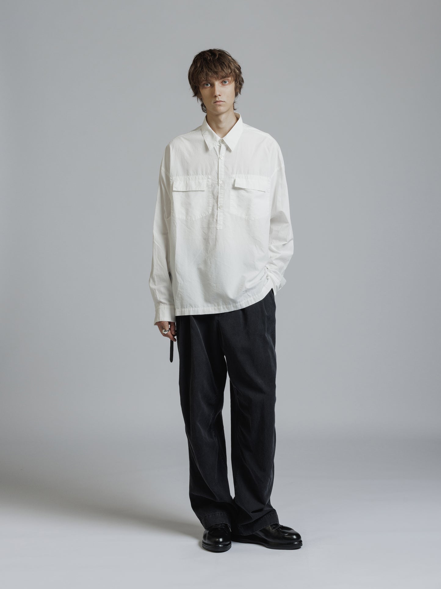 ・フロント上部釦明きの長袖シャツ