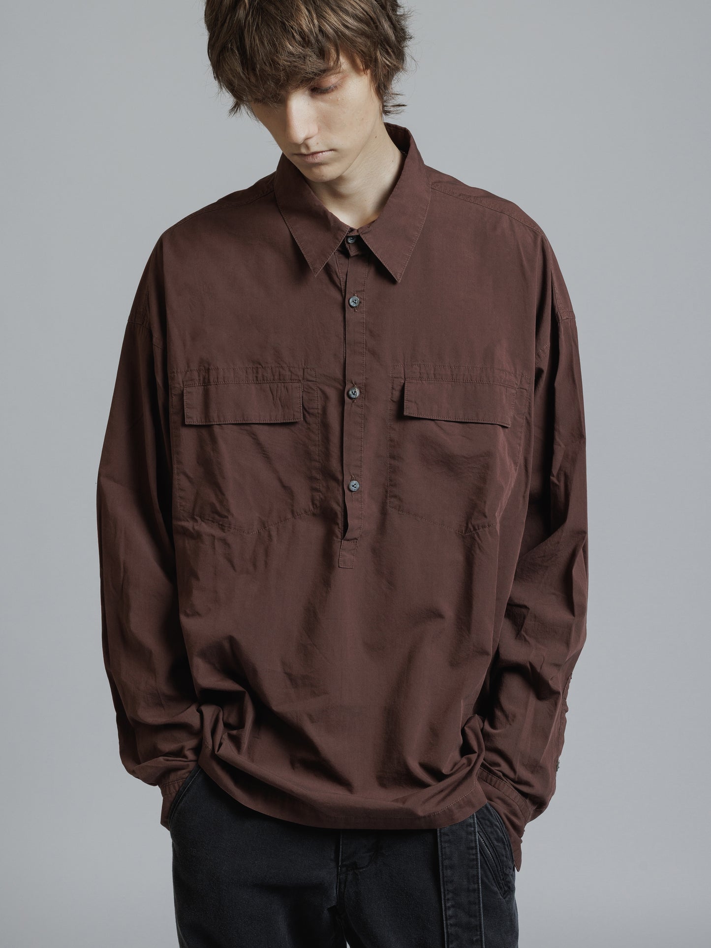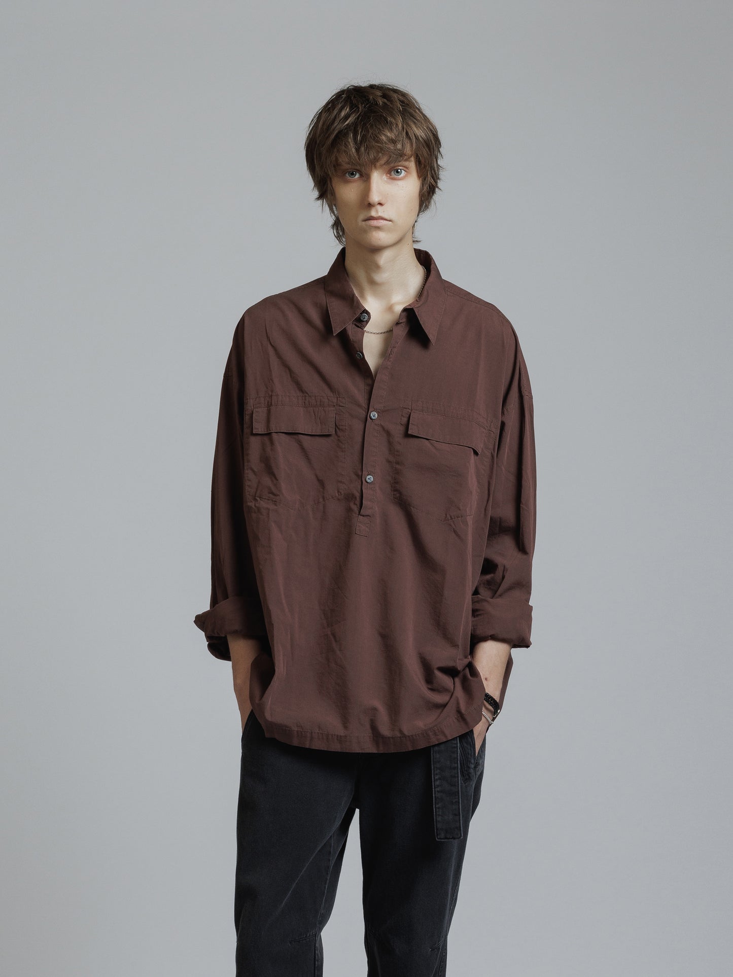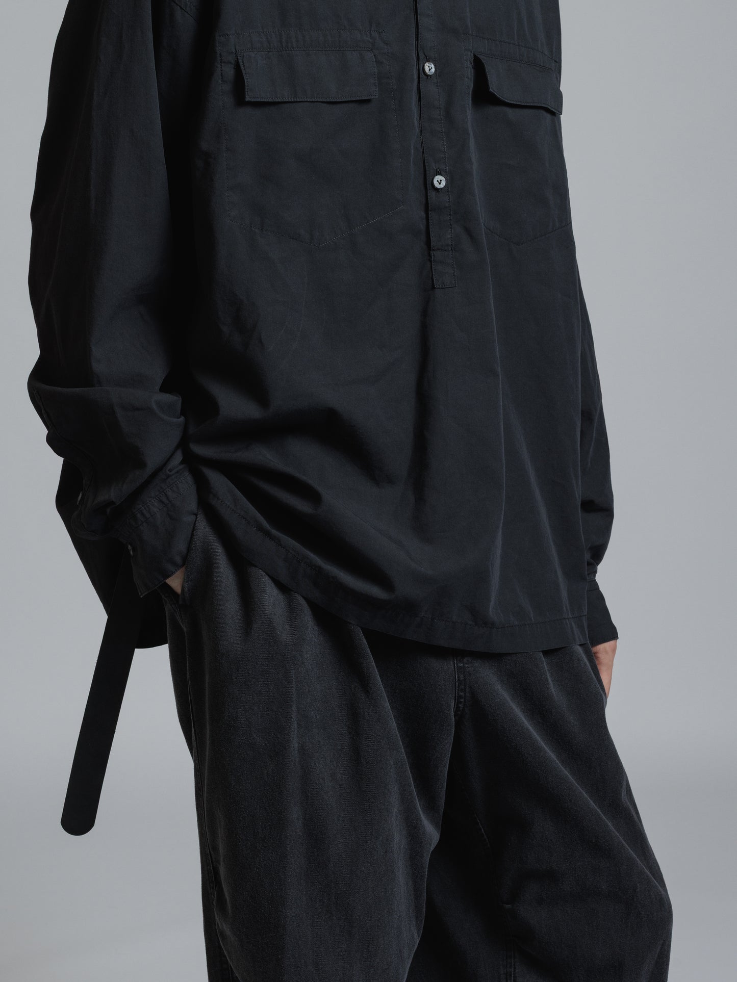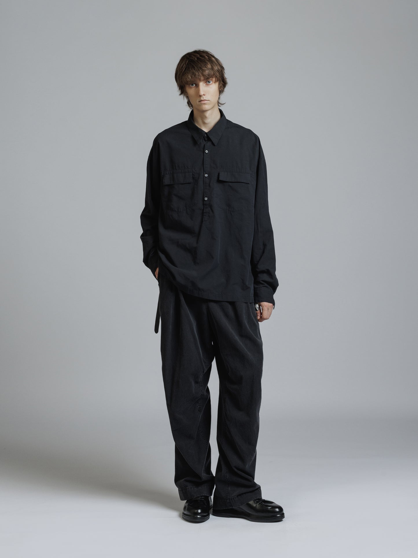 ・フロント上部釦明きの長袖シャツ