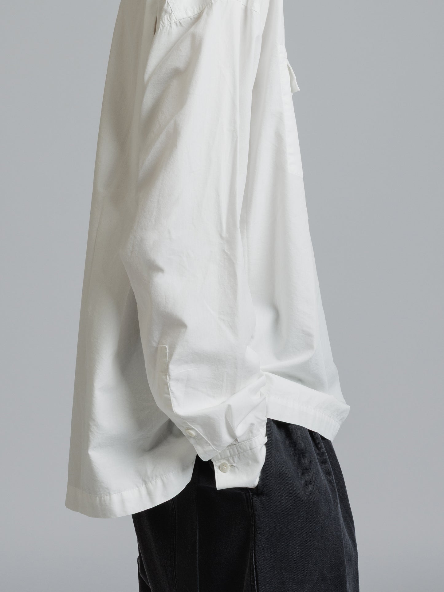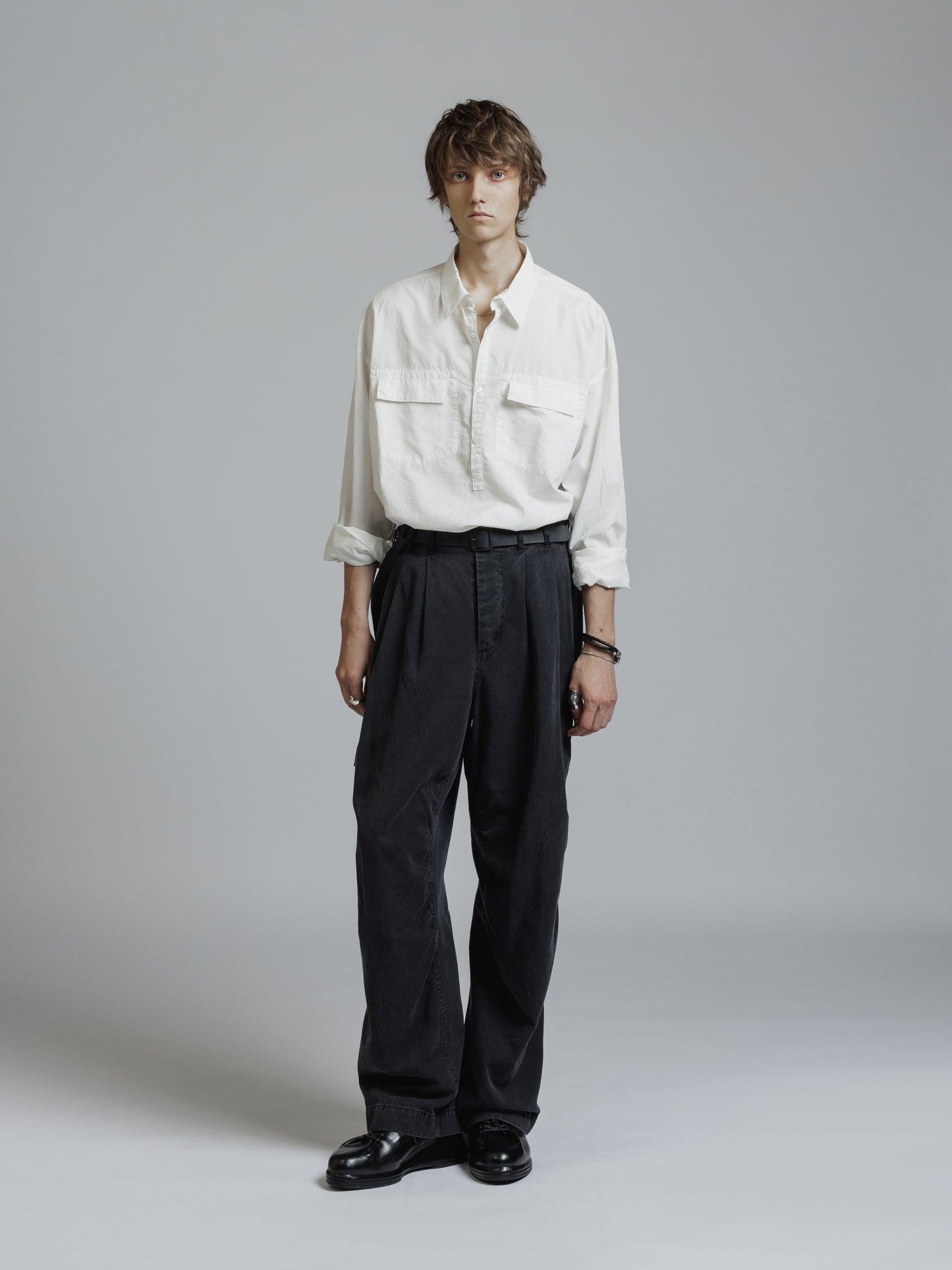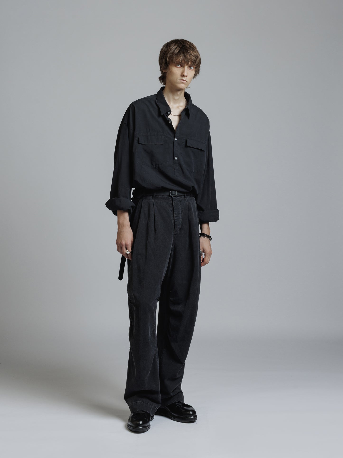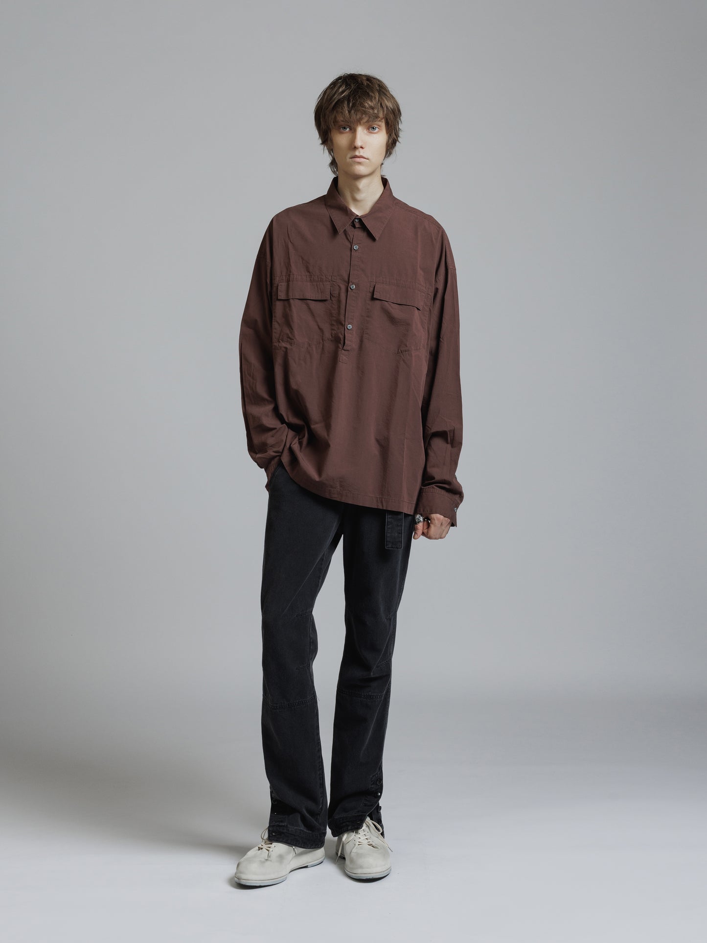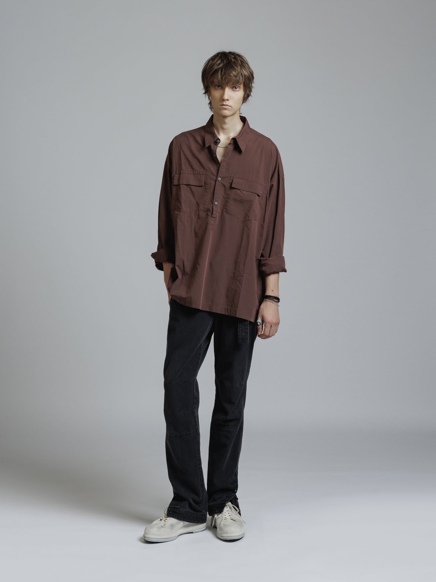 ・フロント上部釦明きの長袖シャツ
