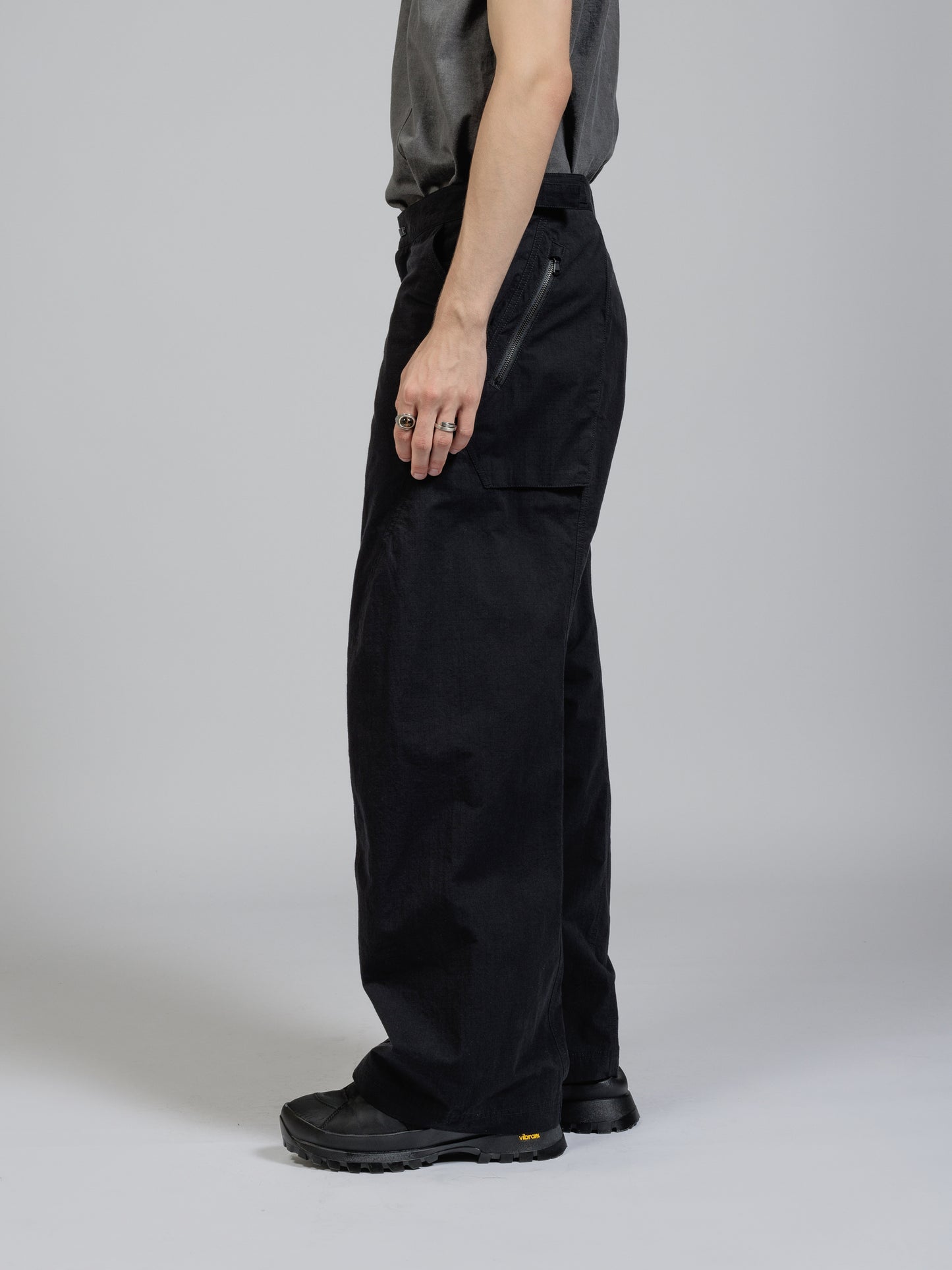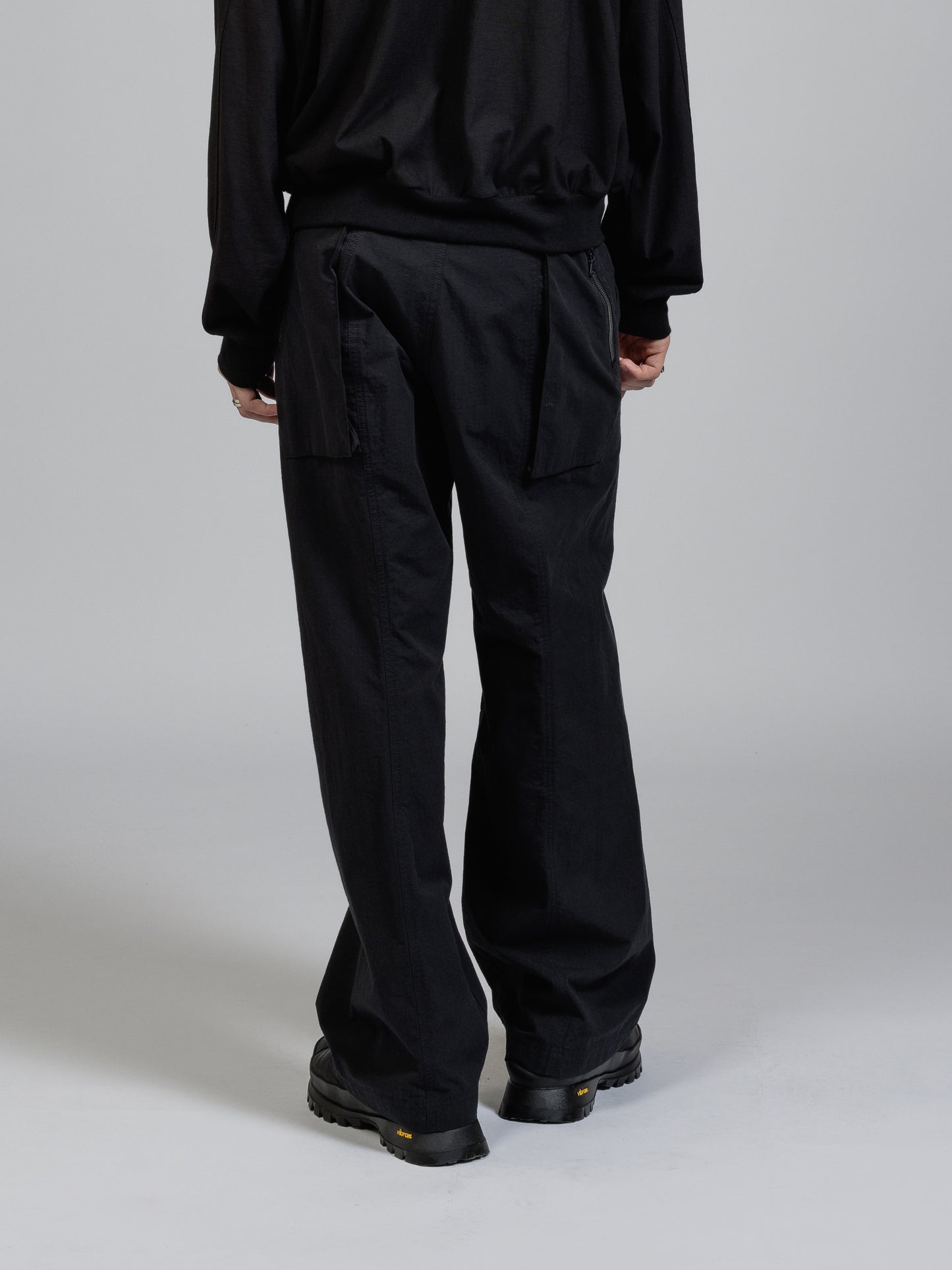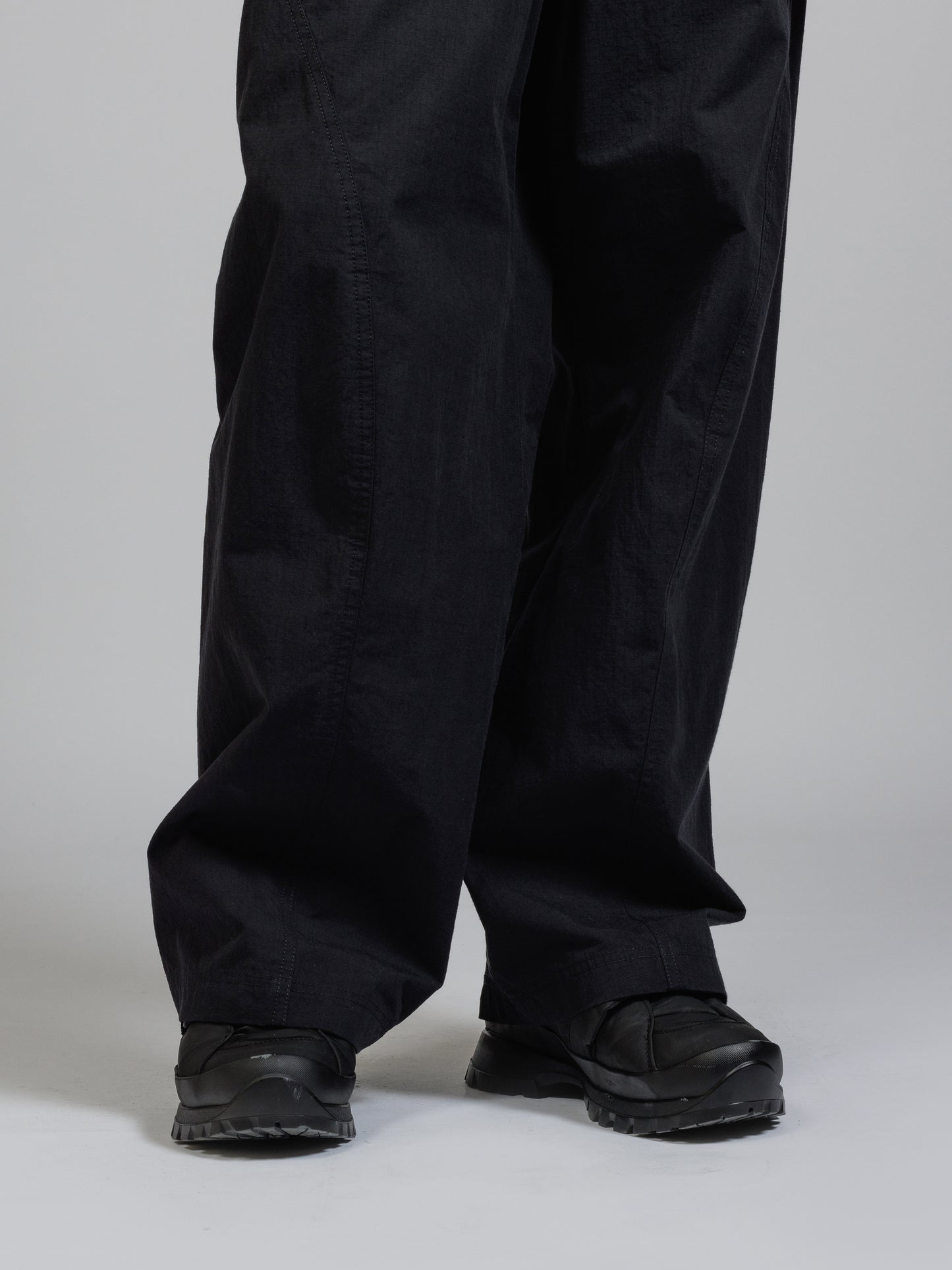 ハリのある高密度のリップストップ生地を使用したワイドパンツ。