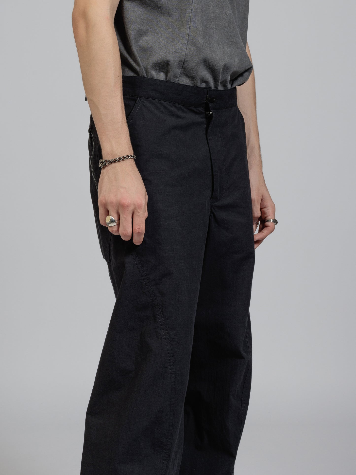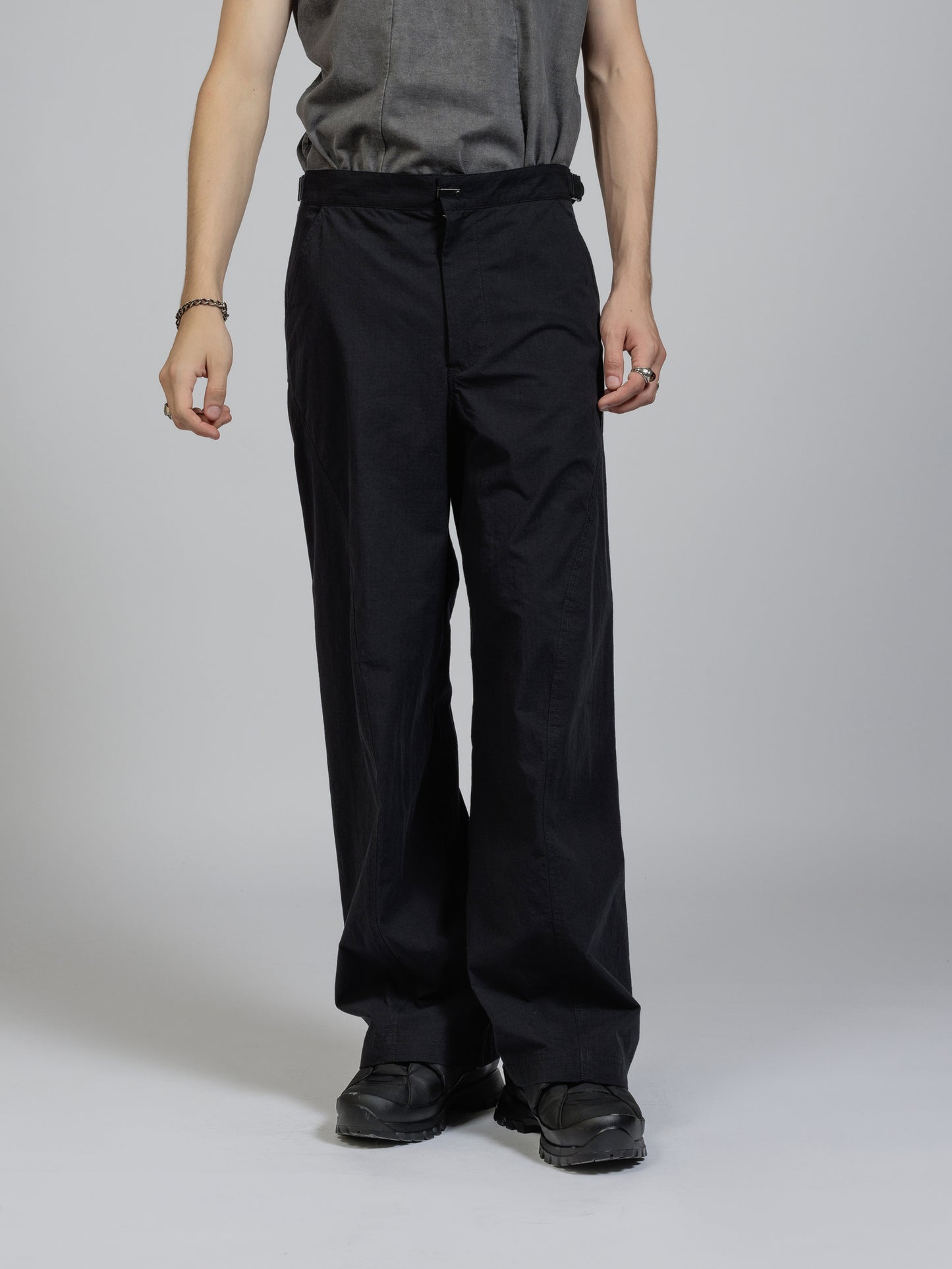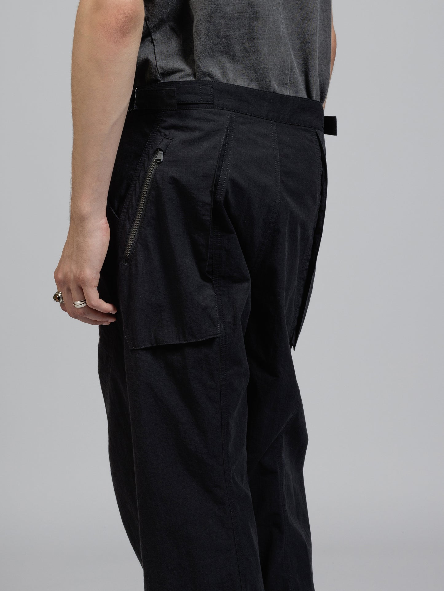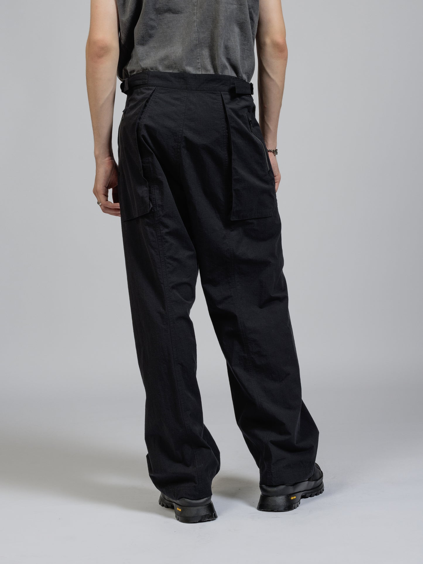 ハリのある高密度のリップストップ生地を使用したワイドパンツ。